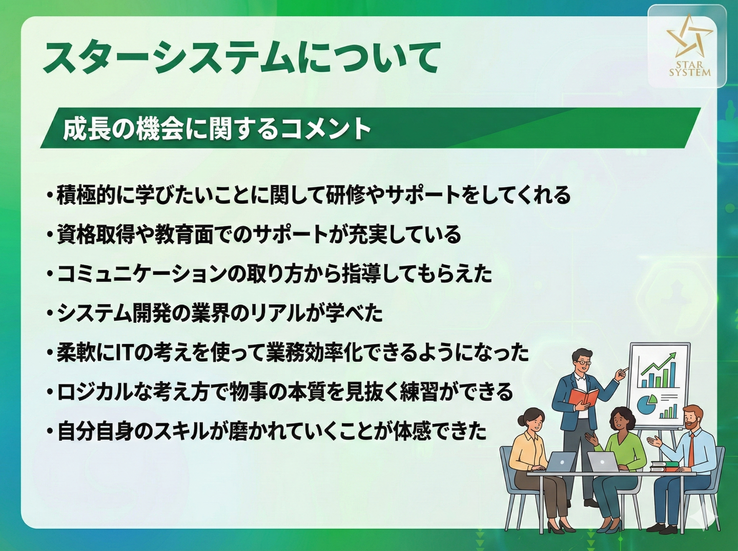 「いまの自分に必要なことを、自分の意思で学ぶ」 そんな前向きな学びの姿勢が、スターシステムの文化として根付いています。