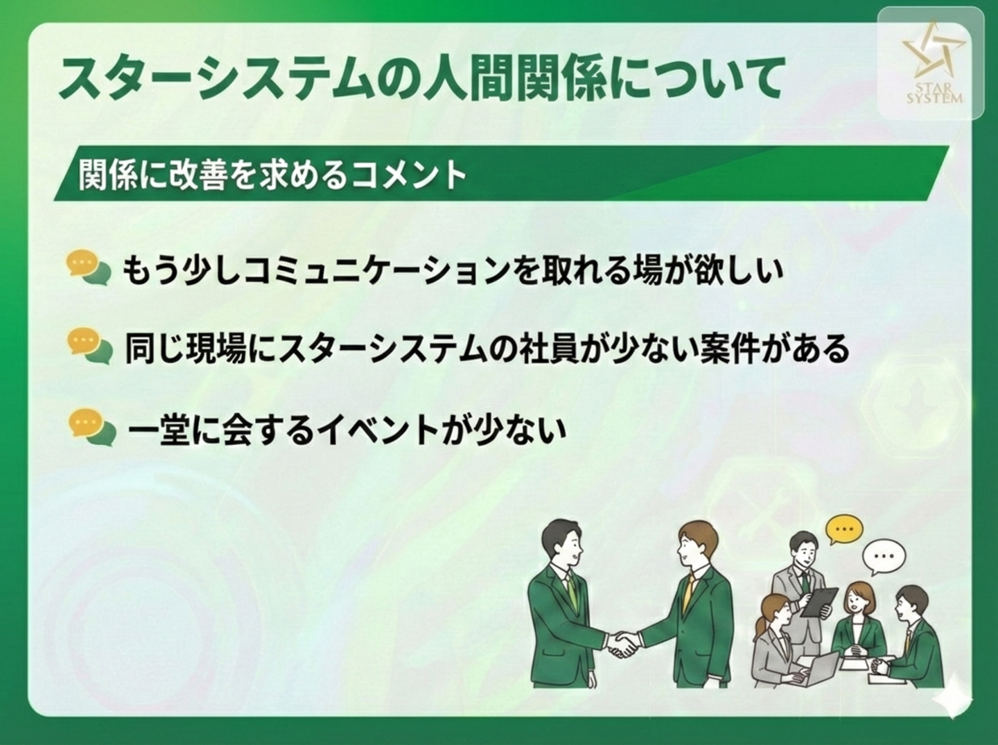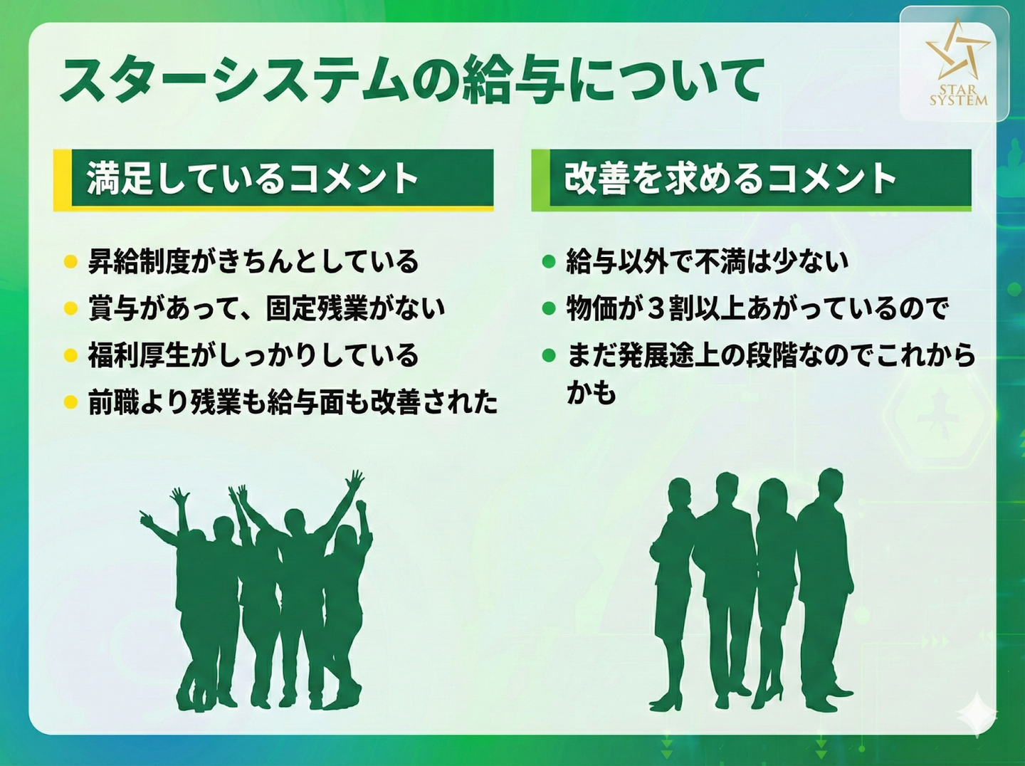 一方で、給与に満足しているという声もありました。前職との比較や、福利厚生などの条件面をきちんと考慮すれば ”満足感を感じられている方も一定数以上いる" ようです。どのポイントで自身が満足度を感じられるのか、そのポイントがスターシステムにあるのかを考えてみるといいかもしれませんね。