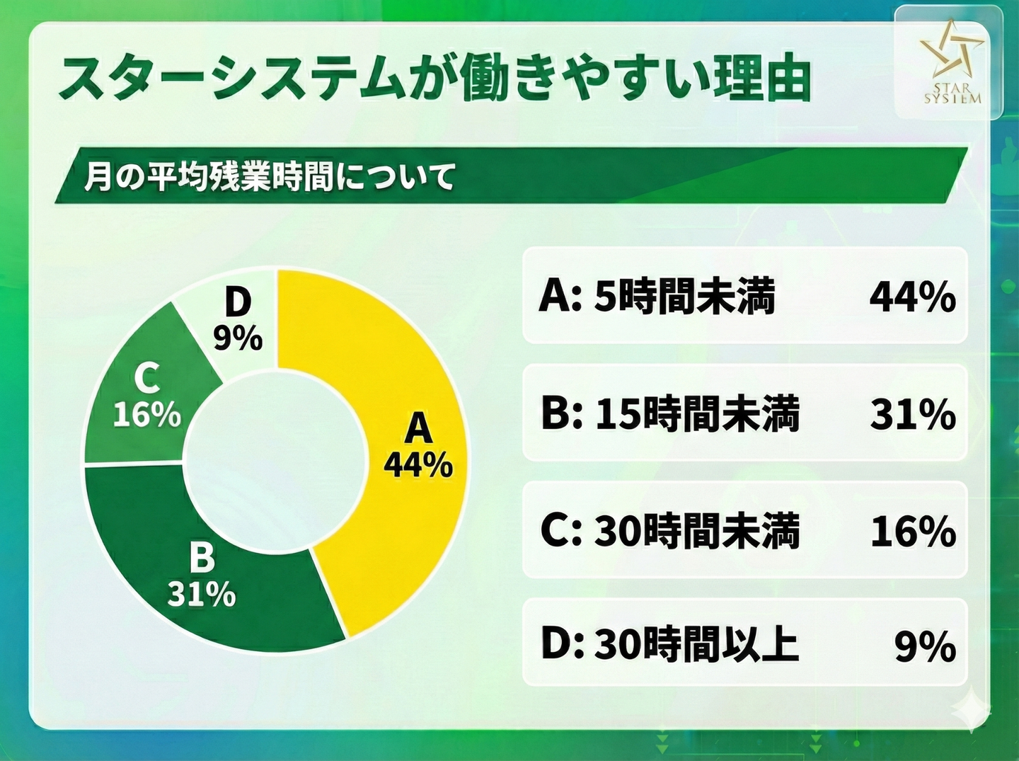 スターシステムの月の平均残業時間を調査すると、5時間未満と答えた人が最も多く「44.0%」でした。