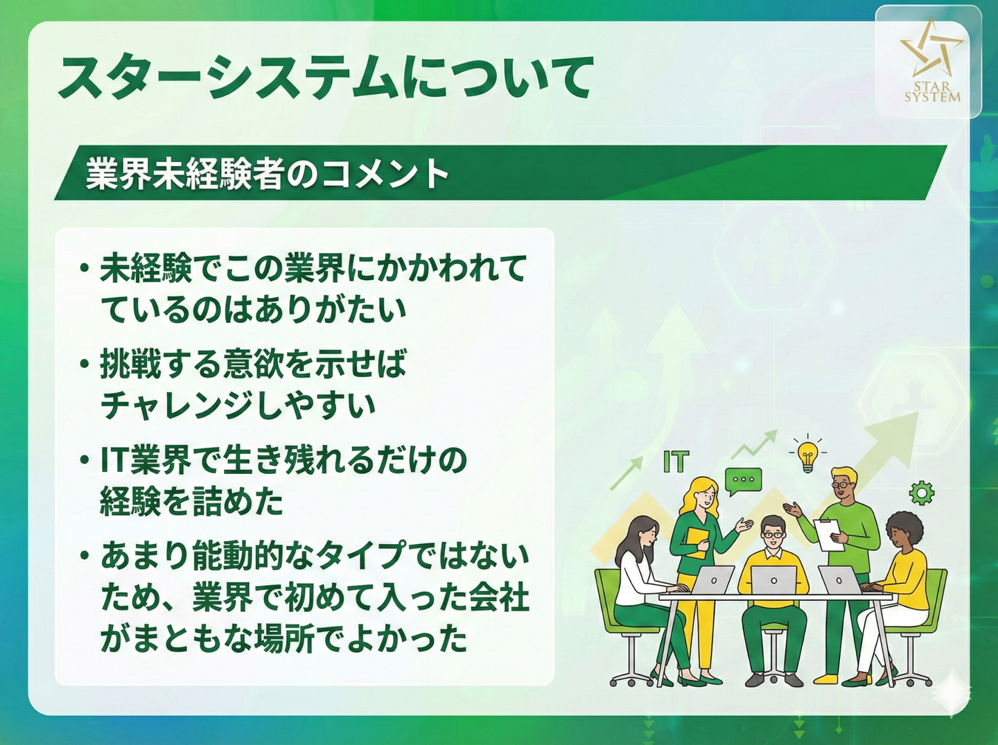 お伝えしたように、スターシステムは社員が成長できるような環境が整っています。「この先IT業界でやっていきたい」という気持ちがあれば、未経験でもチャレンジしやすい会社といえるのではないでしょうか。