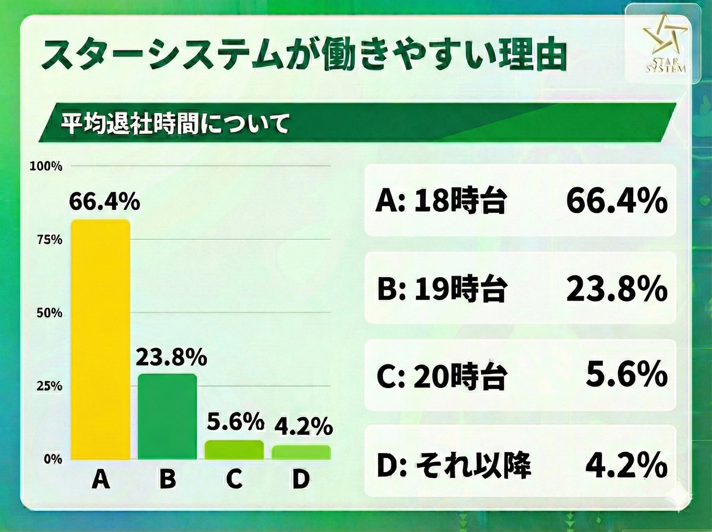 スターシステムの平均退社時間は18時台が「66.4%」