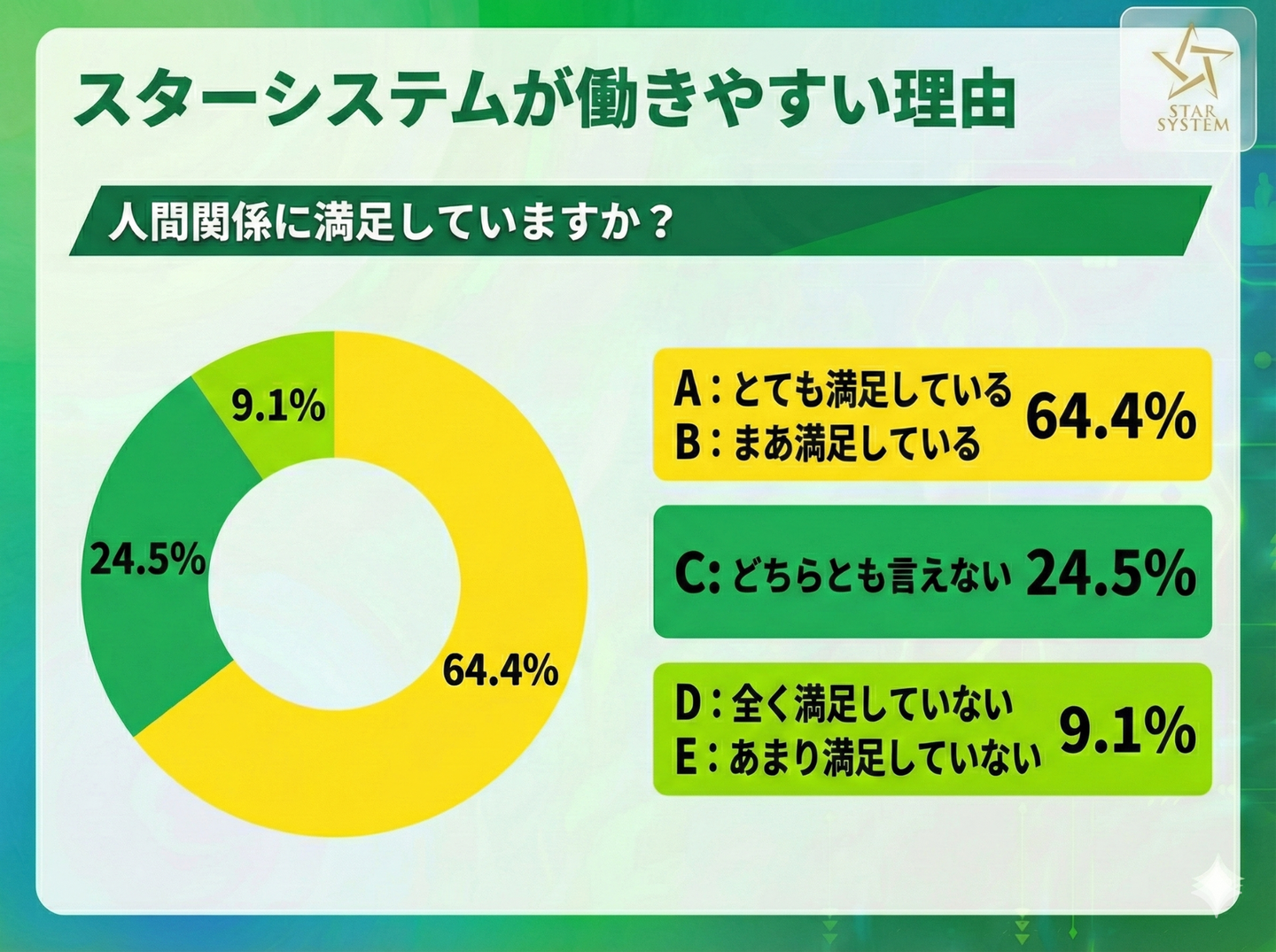 スターシステムの人間関係の満足度を尋ねると、とても満足している「12%」、まあ満足している「52.4%」ということで、合わせると「64.4%」の人が満足と回答しています。
