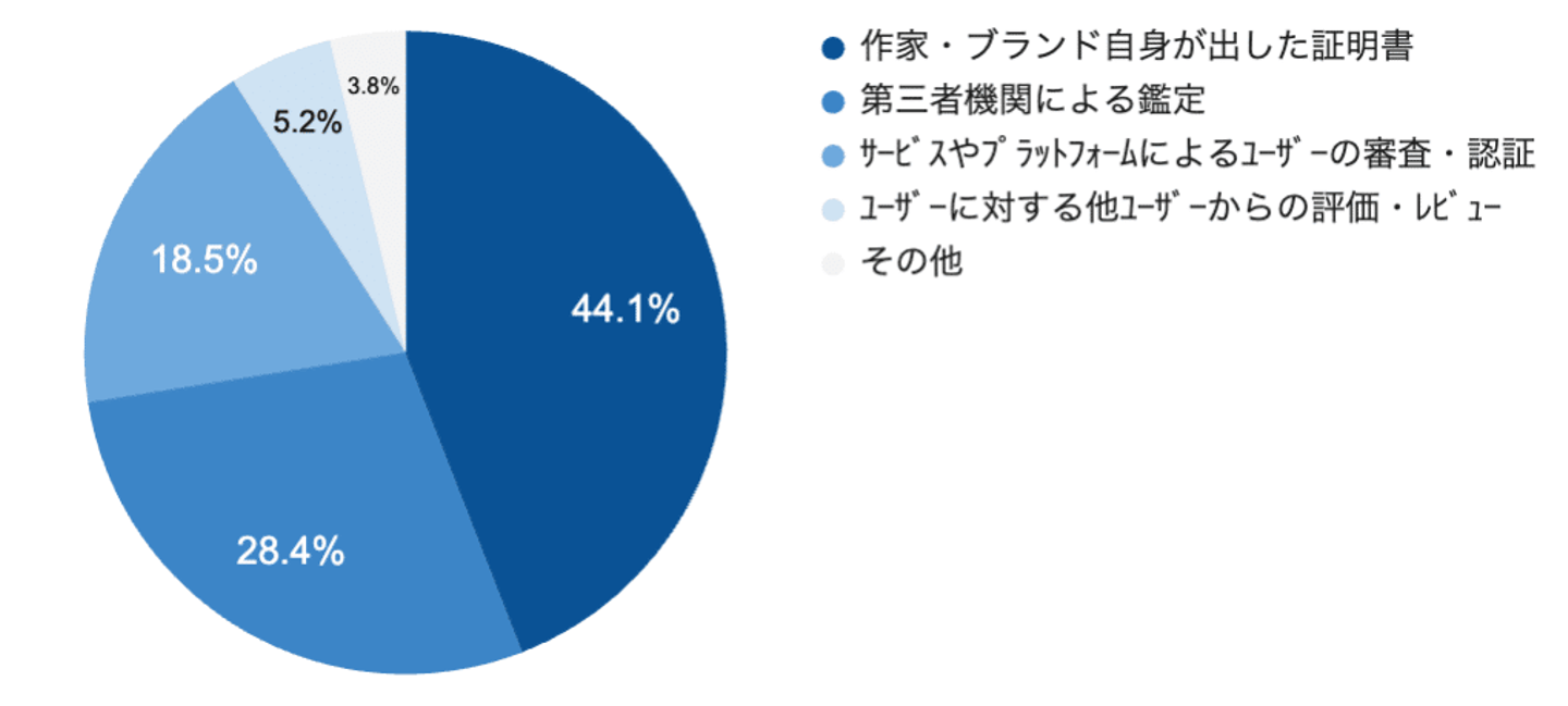 「作家・ブランド自身が出した証明書」が最も多く45%、続いて「第三者機関による鑑定」 が28%。「サービスやプラットフォームによるユーザーの審査・認証」と「ユーザーに対する他ユーザーからの評価・レビュー」は合わせても24%と、相対的に信頼度が低い結果となりました。