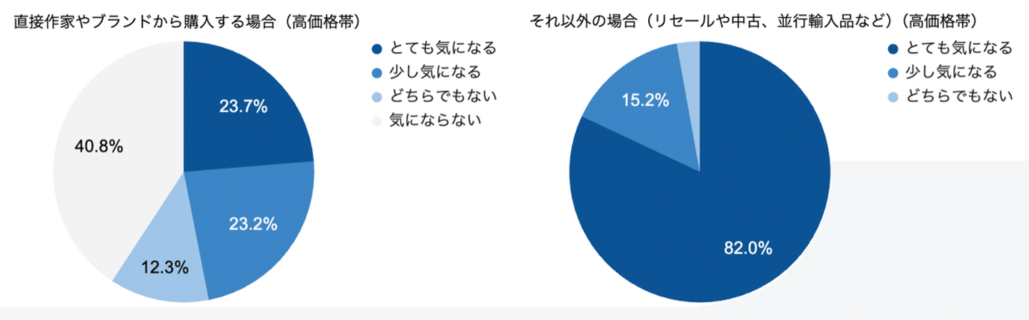 価格帯による関心度の違いは一次流通においてはほとんど見られませんでした。一方で二次流通に関しては、高価格帯において「とても気になる」の割合が82%となり、中価格帯の59%よりも極めて高い結果となりました。