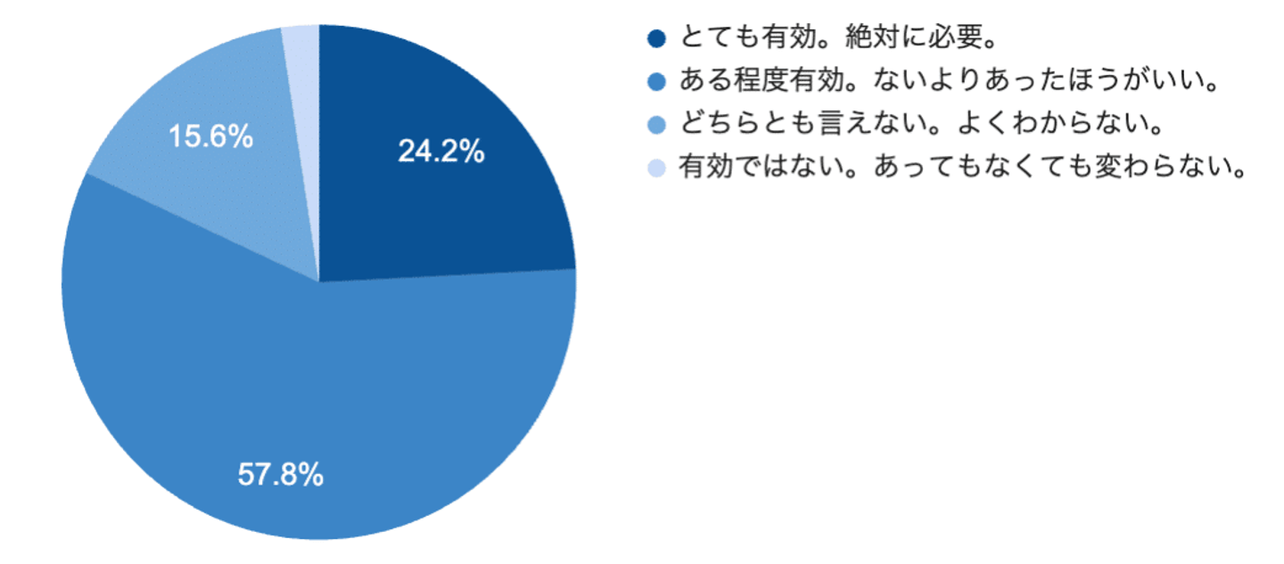 82%の回答者が「とても有効」または「ある程度有効」と回答しました。ICチップやブロックチェーンなどのテクノロジーへの期待感が極めて高いことがうかがえます。