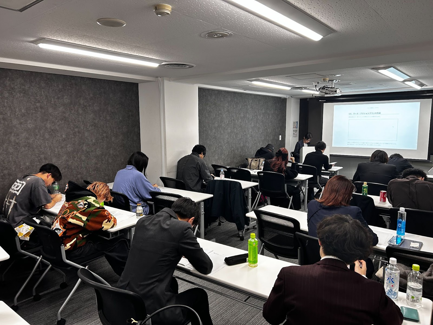 研修前半は1年目の振り返りを行い、社会人2年目に求められるスキルの解説や、主体的に行動するための目的意識の重要性などを講師から解説いただきました。