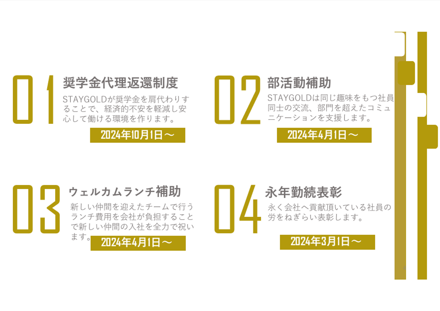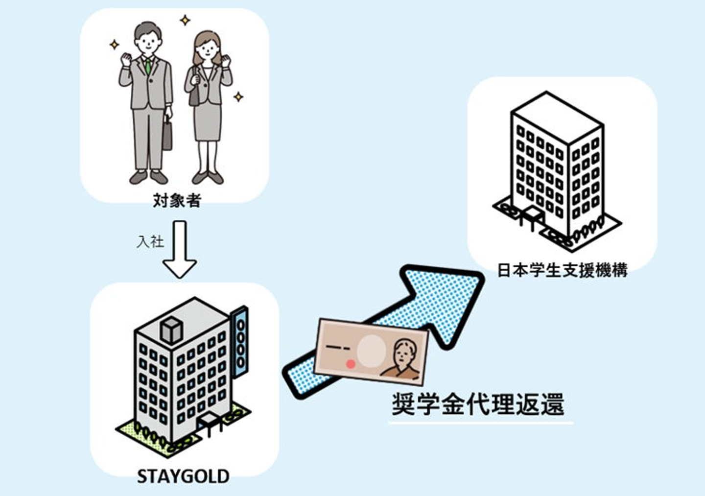 当社では、企業理念(Value)において【Be STAYGOLD】を掲げており、常に挑戦し輝き続けるため、社員が学び成長し、のびのびと働ける企業でありたいと考えています。 その一環として2024年10月より、日本学生支援機構(JASSO)奨学金を返還中の従業員を対象として、「奨学金返還支援(代理返還)制度」を利用した【奨学金代理返還制度】を福利厚生として導入します。「STAYGOLDがあなたの貸与型奨学金(借金)をあなたに代わって返済します、奨学金代理返還制度START!」を合言葉とする本制度は、現段階で既存社員及び入社予定社員のうち約30名の利用を見込んでいます。