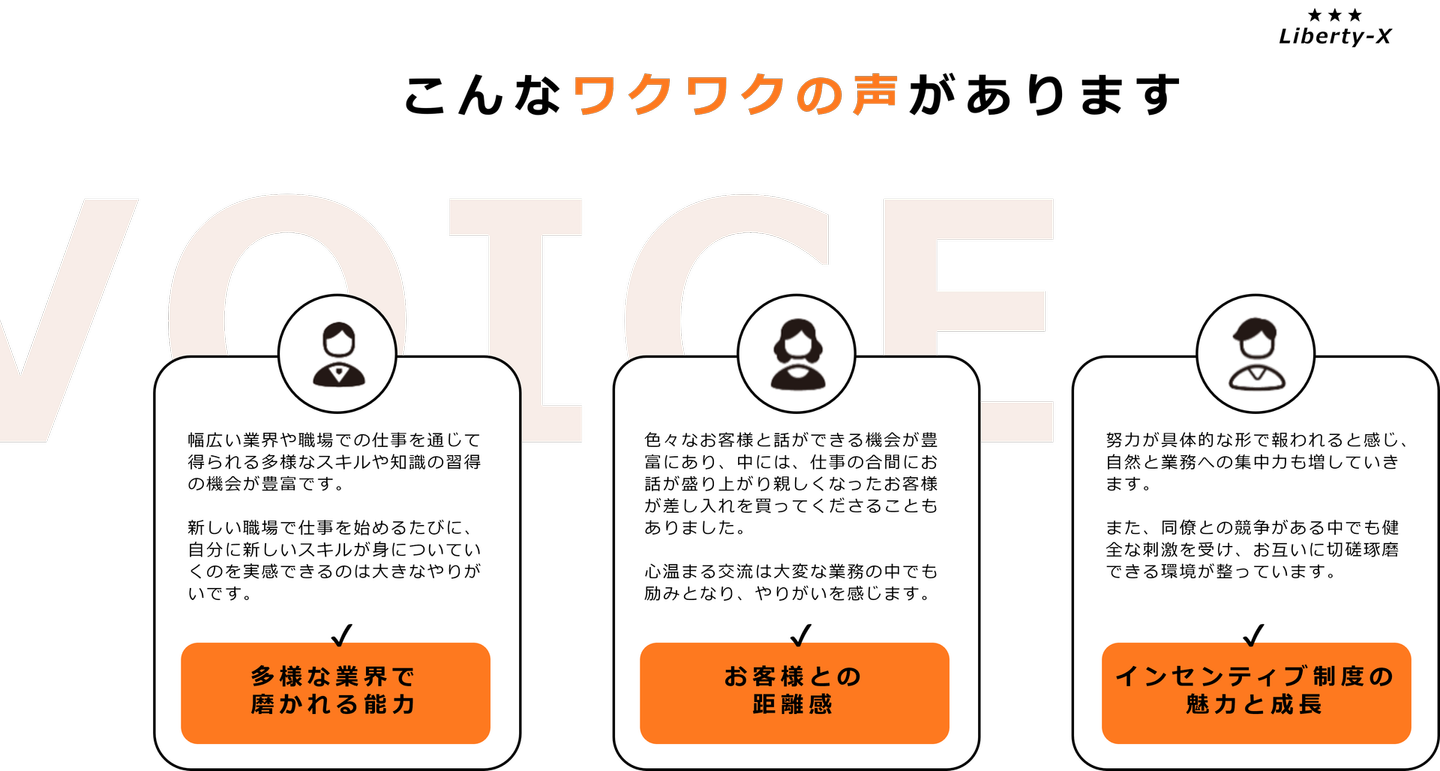 『Liberty-X』は、その名の通り、ただの業務委託や派遣にとどまらず、個々の価値を最大化し、従業員一人ひとりが自身の働き方やキャリアを選択できる、そんな自由な世界を創造するためのステップです。業界の枠を超えて、個人が自己実現できる場所を提供することで、私たちは社会に新たな風を吹き込むとともに、ポジティブな影響を与えたいと考えています。