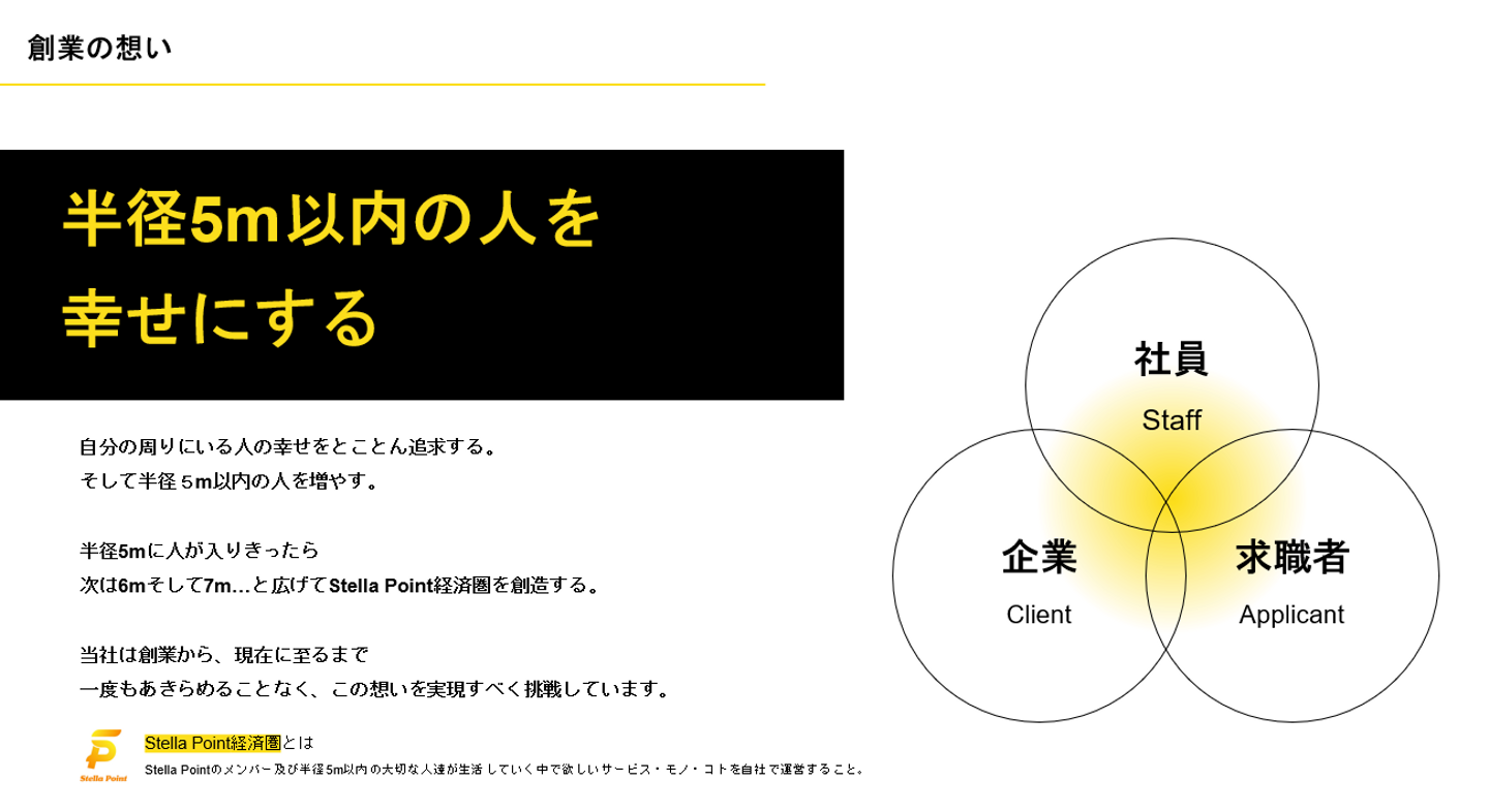 「Liberty-X」の発足に際して、最も重要なのはStella Point経済圏の創造です。私たちが目指すのは、半径5メートル以内の人々を幸せにし、その幸せを広げていくことです。これまでの活動では、主に採用領域での支援に力を注いできましたが、アウトソーシング事業を通じてその影響力はさらに広がり、クライアントやサービスを受けるユーザーにも良い波及効果をもたらします。