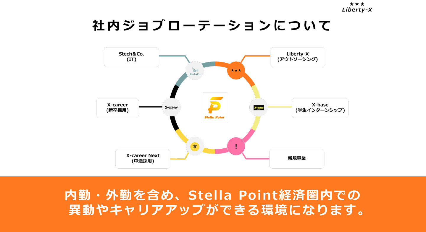 『Liberty-X』では、内勤と外勤を含むジョブローテーションを通じて、多様なキャリアパスを提供します。従業員が自身のスキルを最大限に発揮し、新たな可能性を追求できる環境を整備しています。 その基盤となるのが、Stella Point経済圏です。この経済圏は、当社の提供するサービスやクライアントネットワークを中心とした広がりの中で、従業員が自由にキャリアを描ける環境を意味します。