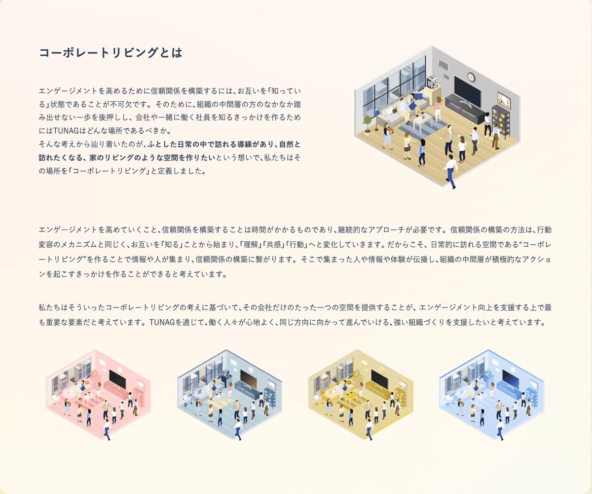 TUNAGは、従業員が自然と集まり、コミュニケーションが生まれる“コーポレートリビング”のような存在でありたい。そんな想いからプロダクトとして再構築を進めていきました。