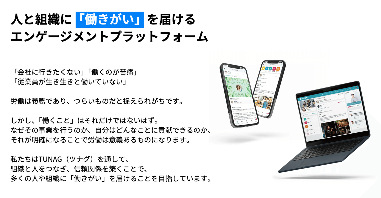 TUNAGの事業理念は、「人と組織に働きがいを届ける」ことです。