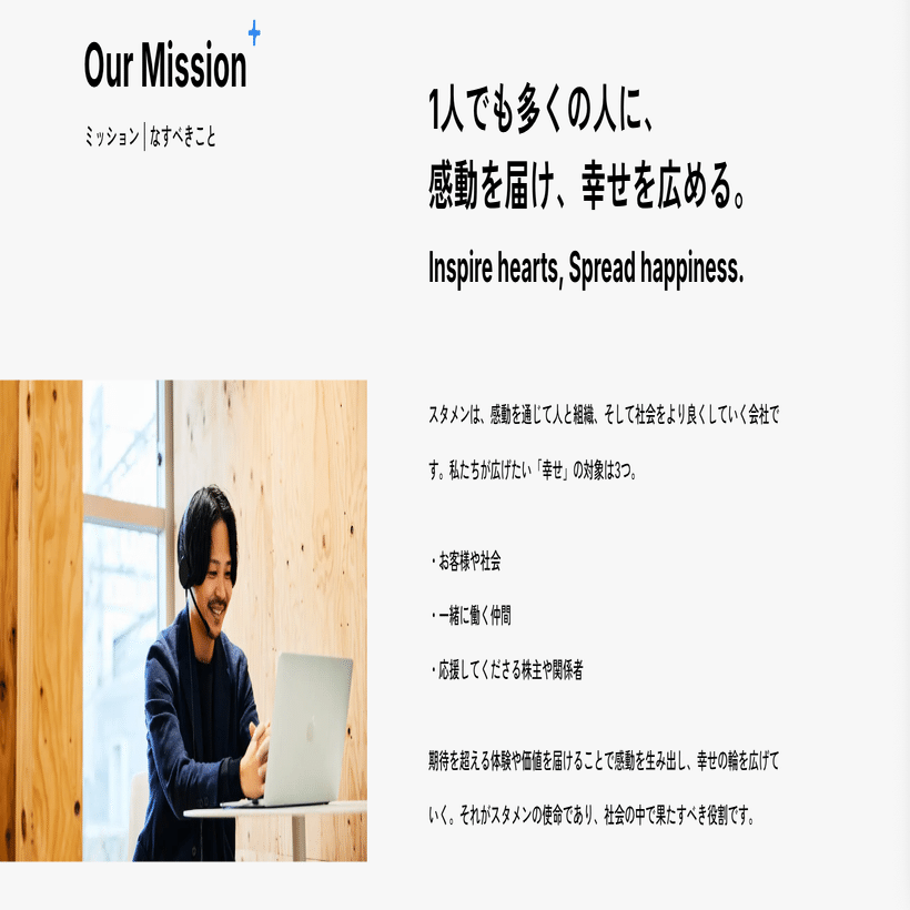 Missionである、『1人でも多くの人に、感動を届け、幸せを広める。』は創業時から変わらない、スタメンの存在意義です。