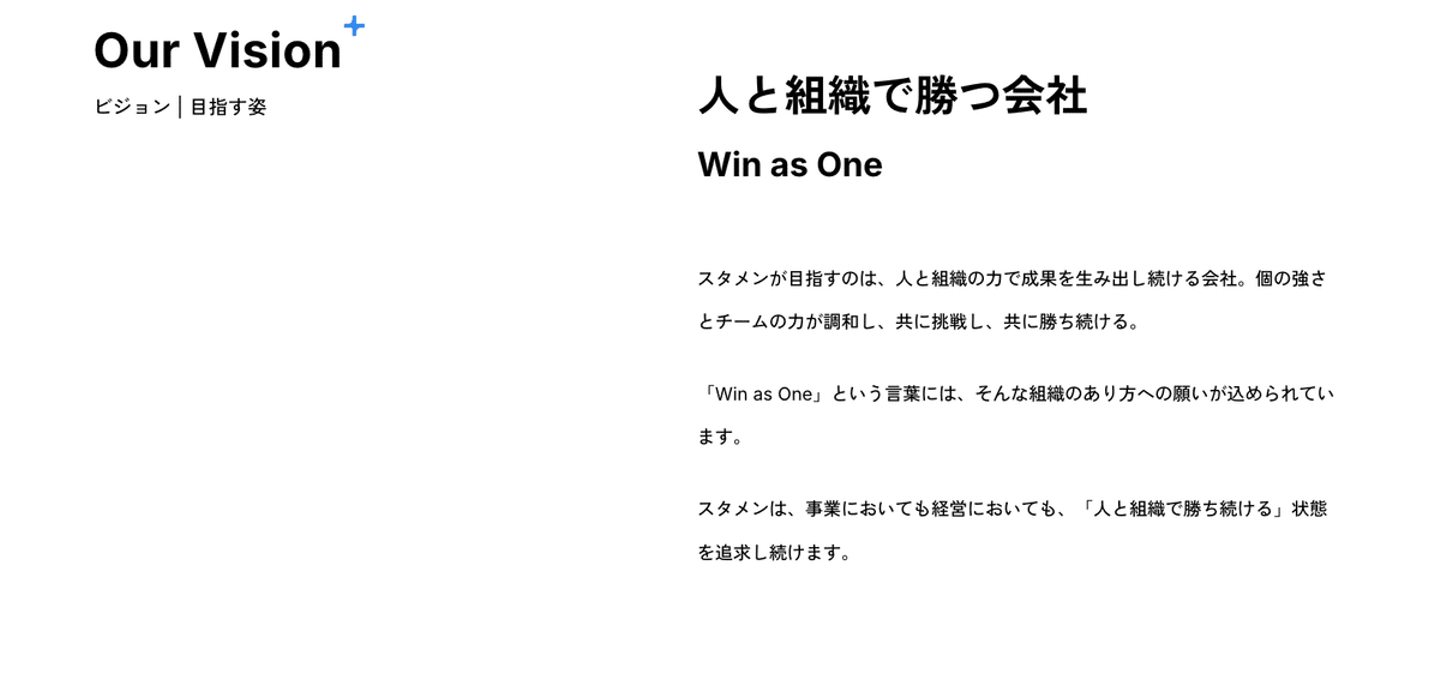 Visionは、スタメン社内ではよく使われていた言葉である『人と組織で勝つ』を掲げています。