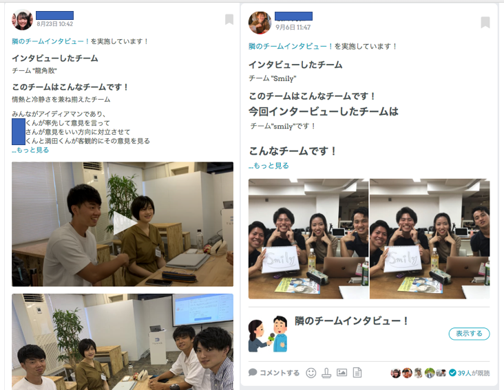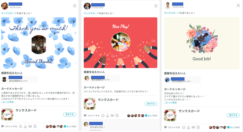 1日を終えると、TUNAG上には、自然にたくさんのサンクスカードの送り合いが発生していました。チームメンバーのお互いの良いところを認め合い、賞賛する、これがこそが“チームエンゲージメント”です。