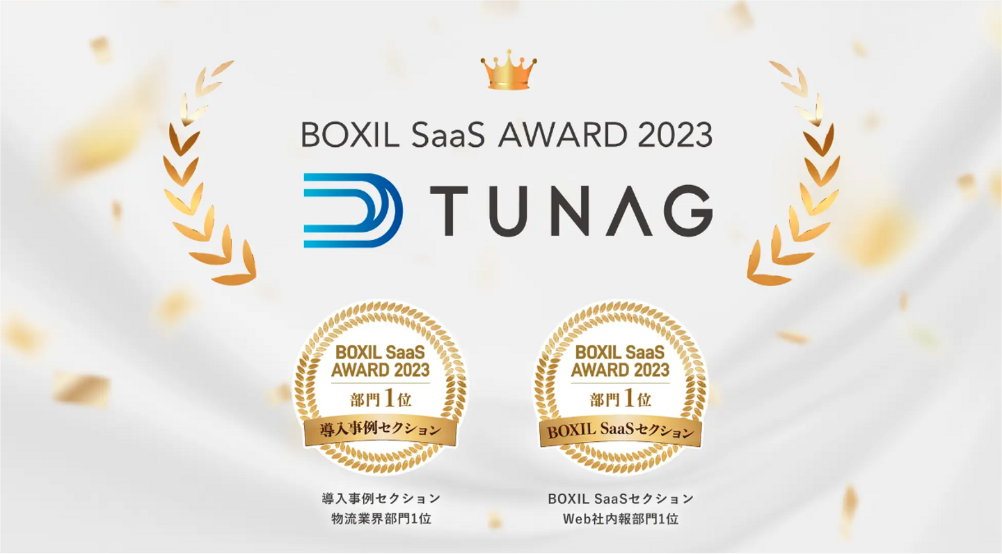 TUNAG」は導入による効果事例と、安定した機能で、高いご評価をいただ、「導入事例セクション」物流業界部門,「BOXIL SaaSセクション」 Web社内報部門で表彰されました。また、同日に発表された「BOXIL SaaS AWARD Spring 2023」でWeb社内報部門の「Good Service」「サービスの安定性No.1」に、併せて選出されました。
