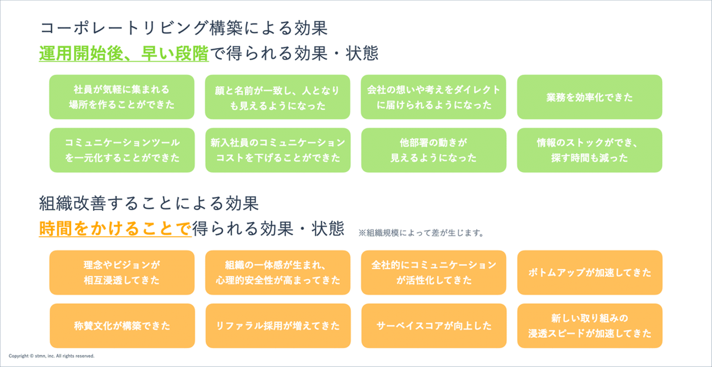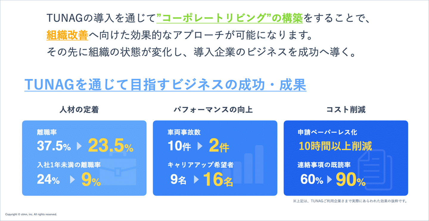 ※コーポレートリビング…スタメンの造語。組織改善の土台となる組織の状態を指し、家のリビングのように日常的に訪れる、自然と訪れたくなる場所(=TUNAG)のこと。