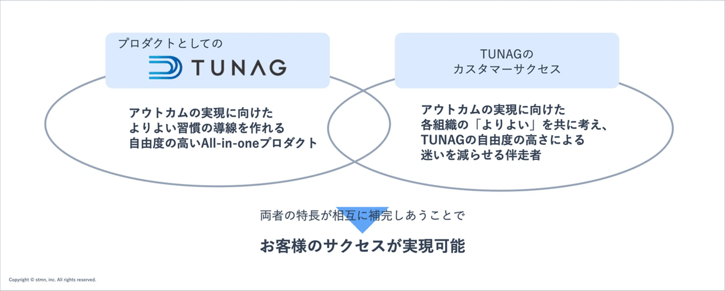 ただ、TUNAGはあくまでも手段の一つなので組織課題がTUNAGの運用だけでは解決できない場合もあります。そういった場合にはTUNAG外の取り組みまではみ出して支援していくこともあります。ただ、どこまでTUNAG外の領域に踏み込んでいくかのライン設定が、スタメンのCSならではの難しい点で、CS部としてその線引きもお客様と自社のサクセスの重なりを意識しながら、見極めていかなければなりません。