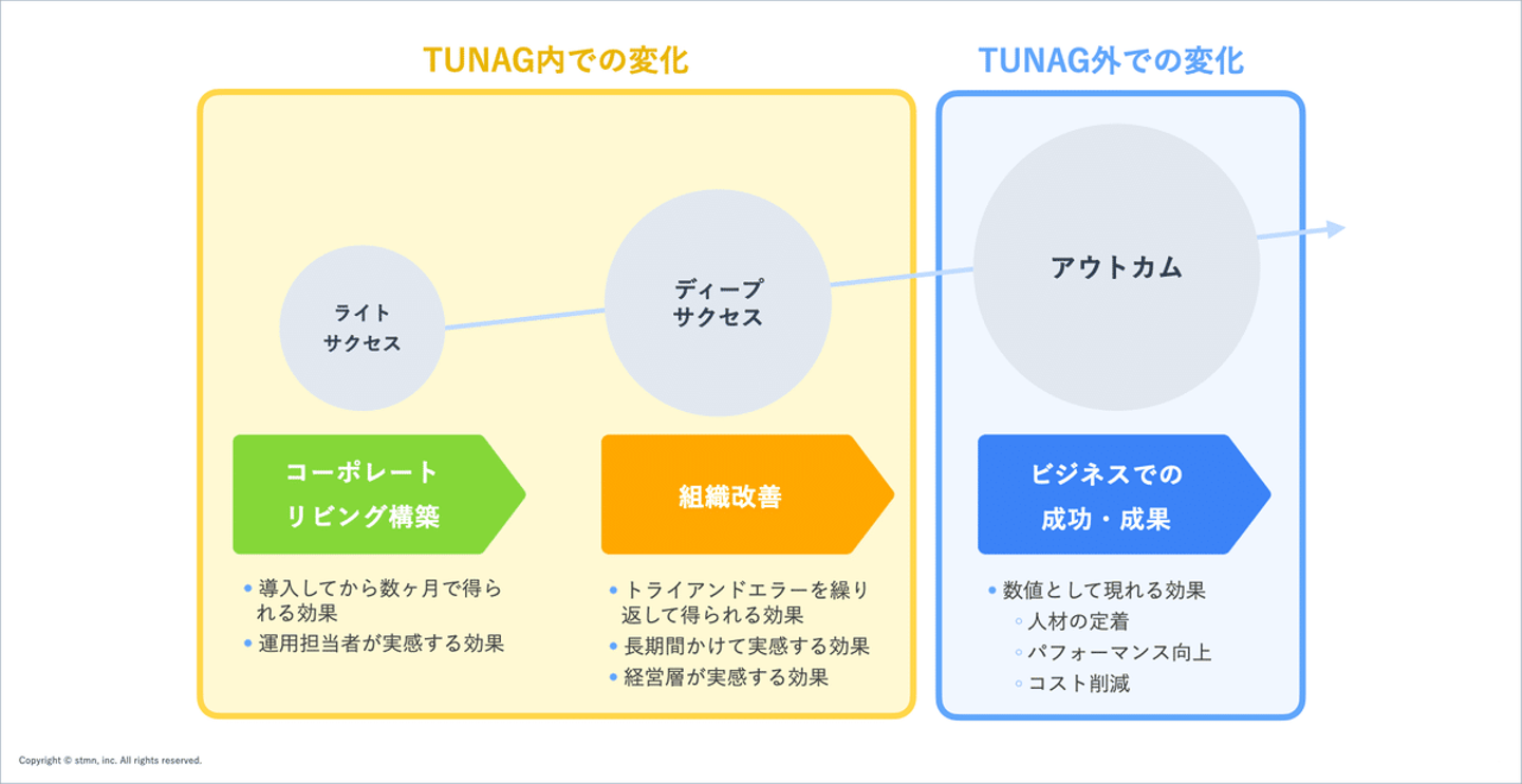 具体的には下記のように段階に分けて、お客様のサクセスを考えています。大きくはTUNAG内外、つまりTUNAG上で可視化できる変化とTUNAGを超えて経営全体で起こる変化に分かれており、私たちが最終的に目指していくのはTUNAG外でのビジネスにおける成功です。そのためには前段でのTUNAG内での改善・変化が必要で、まず第一にコーポレートリビング(※)の構築を目指したTUNAGのオンボーディング(導入に向けた準備)期間を経て、実際に組織改善に向けてPDCAをお客様と並走して回していきます。