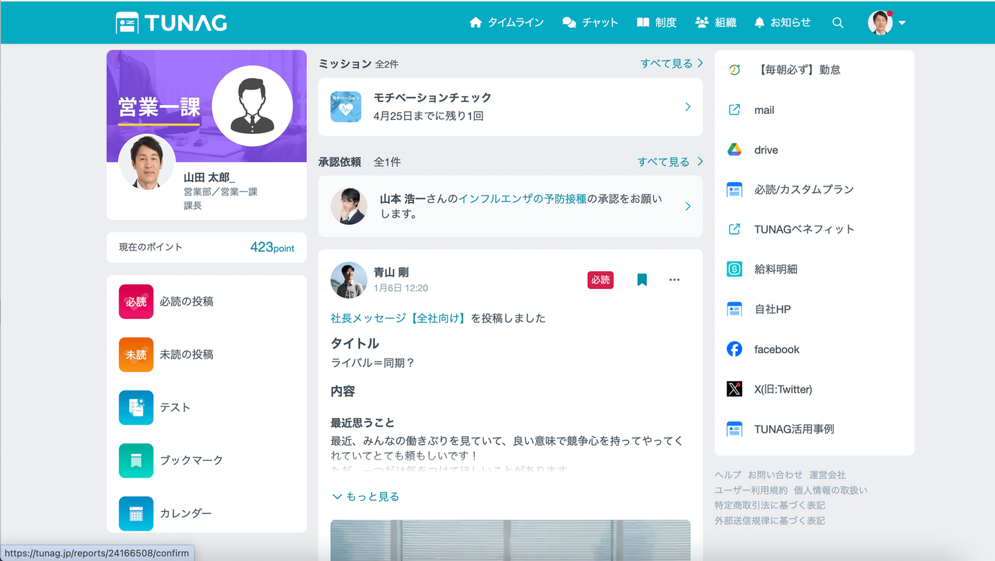 営業推進室では、営業の方がよりお客様に集中できるように、販促コンテンツの制作を担当しています。主には、営業の方が商談で使用する資料の作成を行っています。たとえば、導入企業へのインタビューを資料にまとめたり、企業ごとにカスタマイズしたTUNAGのデモ環境を作成したりしています。