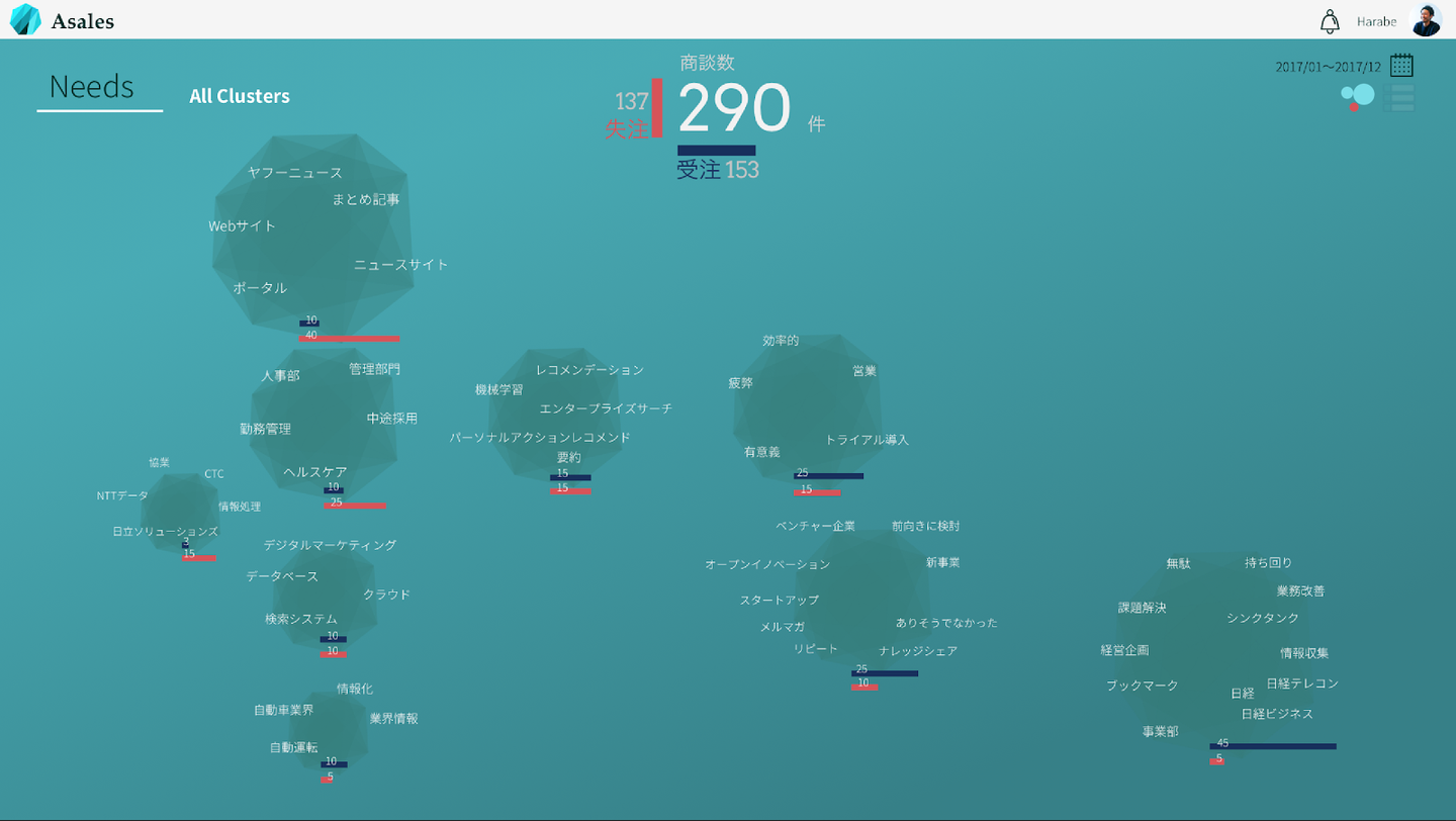 『Asales』は営業活動をAIでサポートするサービスです。AIを用いて、メールや営業日報などの定性的なテキストデータを解析し、「なぜ売れたのか」と「なぜ売れなかったのか」を明らかにします。「クライアントからこの言葉を引き出せば受注に繋がる」というのが分かれば、入社したての人でも戦略的に商談を進められるようになるはずです。