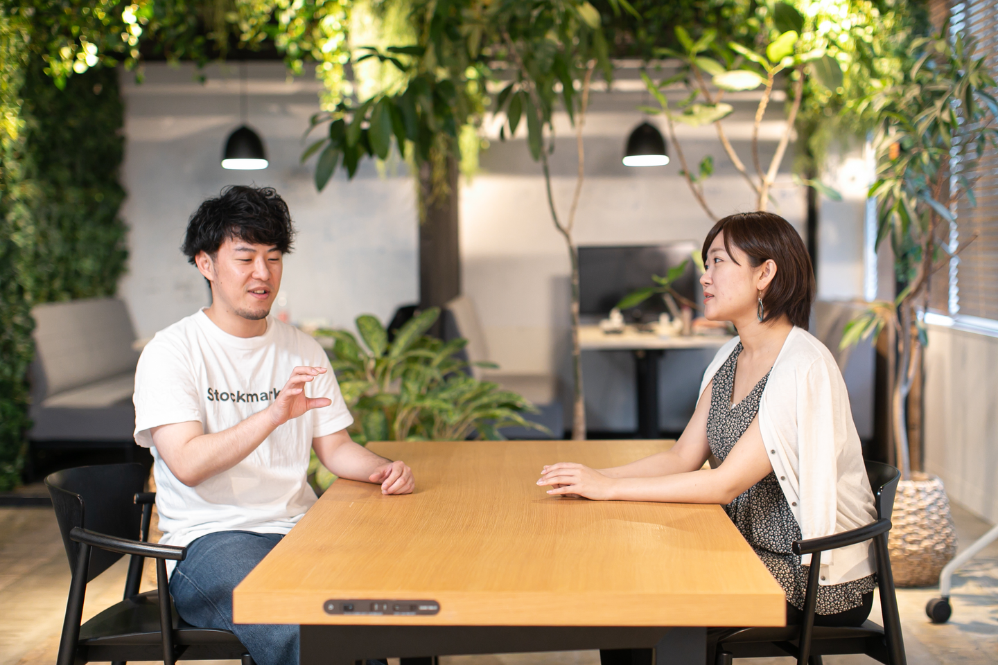 橋本詩織(はしもと しおり):写真右 大学卒業後、株式会社エムエム総研に入社。大企業向けの新規営業、インサイドセールスのディレクションに従事したのち、自社の組織開発推進を行う。ミッション・ビジョンや自社の経営方針の組織への浸透、人事評価制度の改定などを推進。2021年1月にストックマーク入社。マーケティング担当としてセミナー企画・実施、SEO企画、コンテンツ制作などを担当。