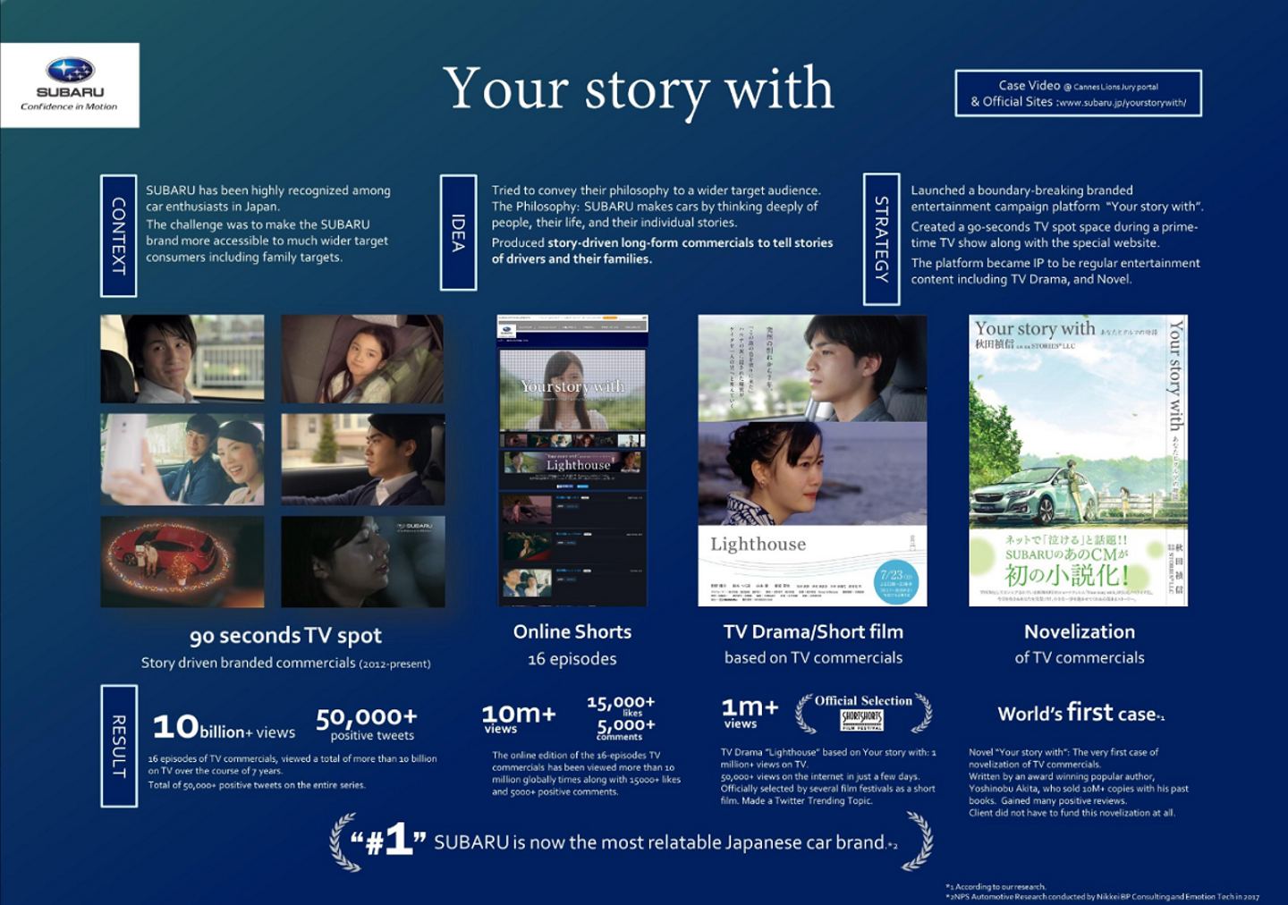 長くお手伝いをさせていただいているプロジェクトのひとつが、スパイクス・アジア2018で受賞したSUBARUの「Your story with」シリーズです。それは、広告の未来としての「ブランデッド・エンターテイメント」の一つの形になっていると思います。90秒CM、ショートフィルムからスタートして、テレビドラマ化(3作品)、そして角川からCM原作の小説が出版されるなど、一般エンターテイメントの流通の中で企業のブランデッドエンターテイメントが放送・配信・出版されるという形で広がってきました。