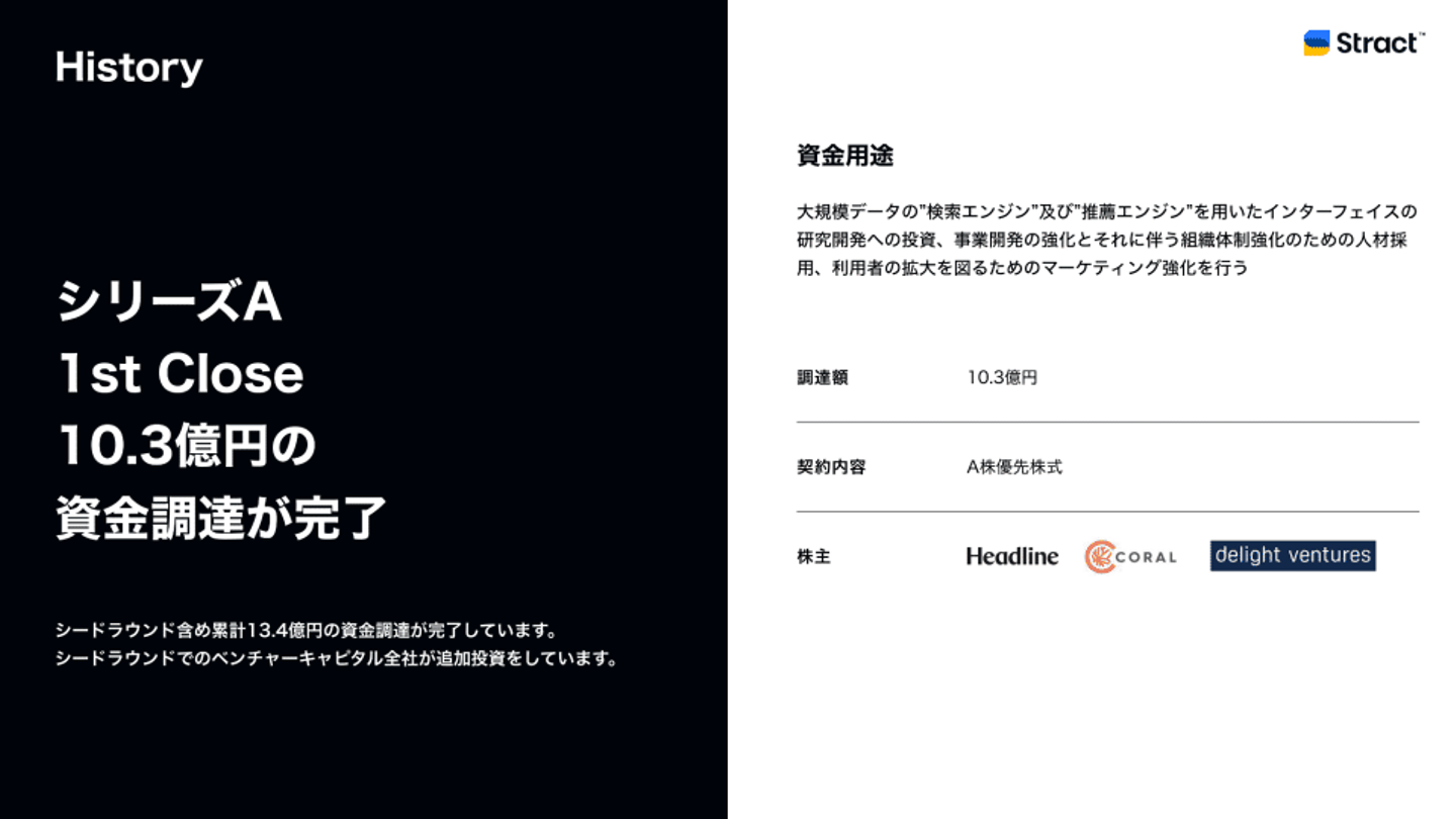 2024年11月、STRACTは創業以来2回目となるエクイティファイナンス、シリーズAの1st Closeで10.3億円の資金調達を実施しました。シードラウンドを含めると累計で13.4億円の資金を調達したことになります。