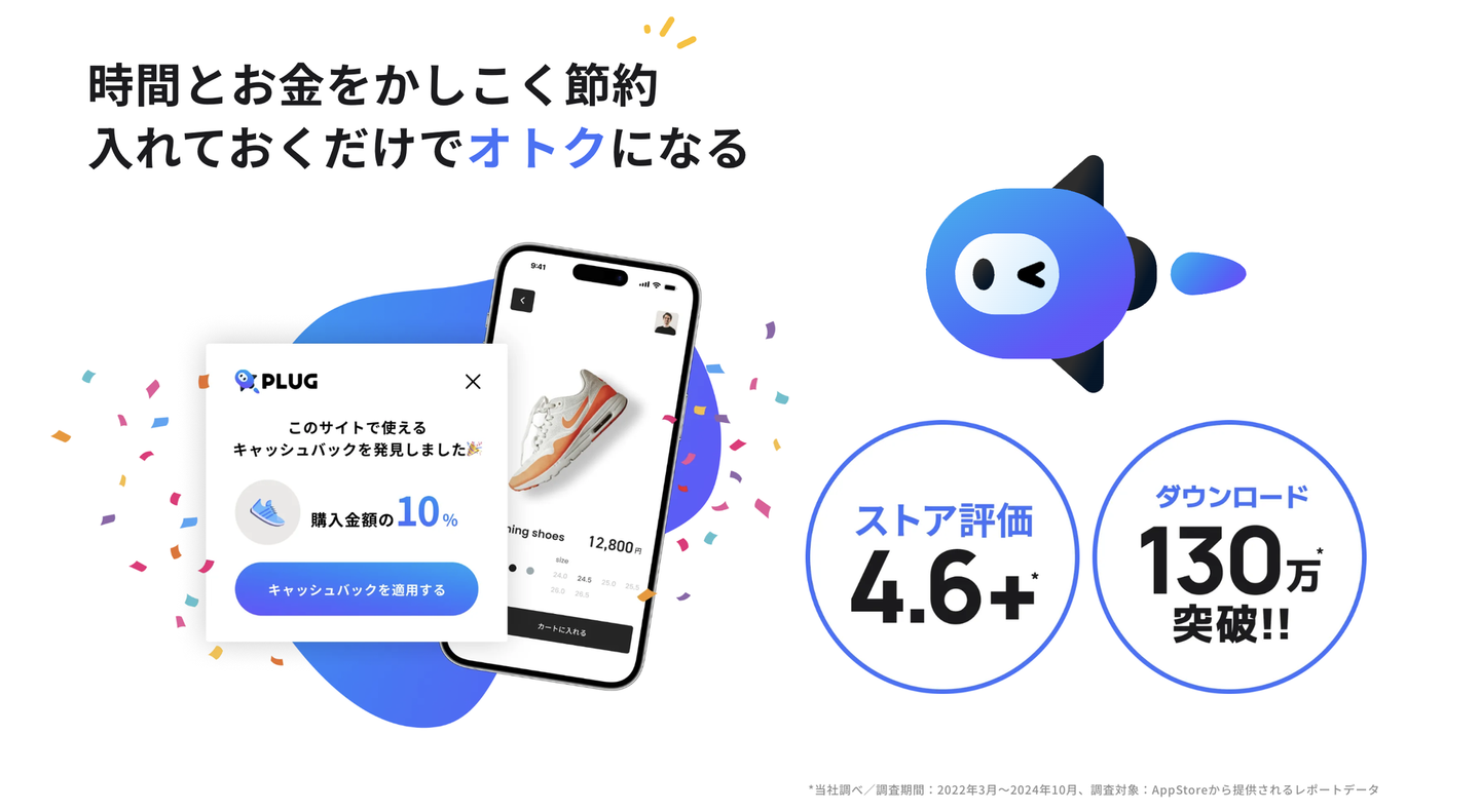 『PLUG(プラグ)』はインストールするだけでお得にショッピングができるショッピングアシストアプリ。“次世代版 価格.com”と表現されることが多く、スマートフォンアプリをインストールいただくことで、Safariのブラウザ拡張機能を用い、自動で様々なサイトから商品の価格比較を行ったり、お得なキャッシュバックやクーポンを自動で発見してくれるサービスです。