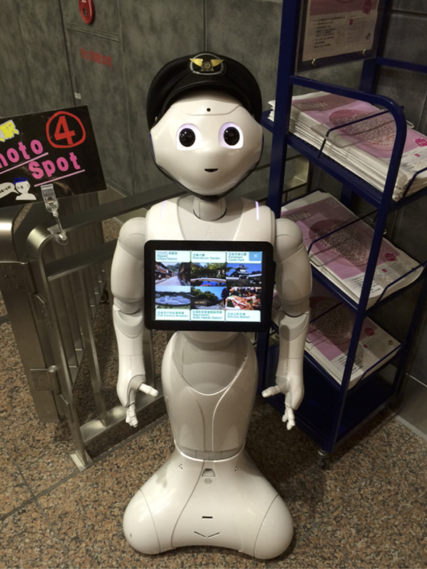さて、金沢駅に着いたらpepperくんのお出迎えが!(駅員さんとして、帽子をかぶってしっかり働いています)