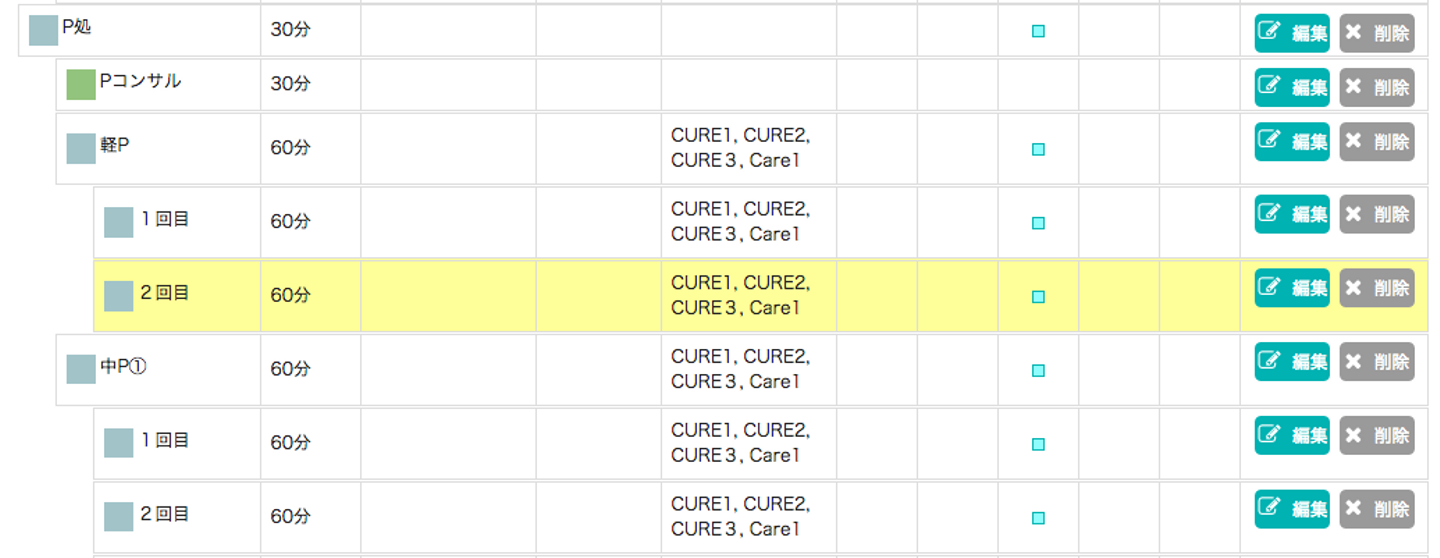 メニュー2で中Pと選択するとメニュー3では、1回目、2回目、3回目、4回目と表示されます。このApotoolのツリー式のメニュー設定で、どのスタッフも分かりやすく、診療メニューの選択もでき、患者様が今どの段階の治療まで進んでいるのか、どこの段階でキャンセルして中断になっているのか、次回の予約を取るときもカルテを見なくても判断できるようになったので、チケット制のメニューにはとても便利に活用できています。患者様によっては初回来院時に4回の来院が必要な治療の場合もその場で4回の予約を取ってくださる患者様もいるので、その日が何回目の治療なのかすぐ分かったり、治療の段階によって準備するものも違うので、カルテを見直さなくてもApotoolだけで患者様の管理ができるのはとても便利です。