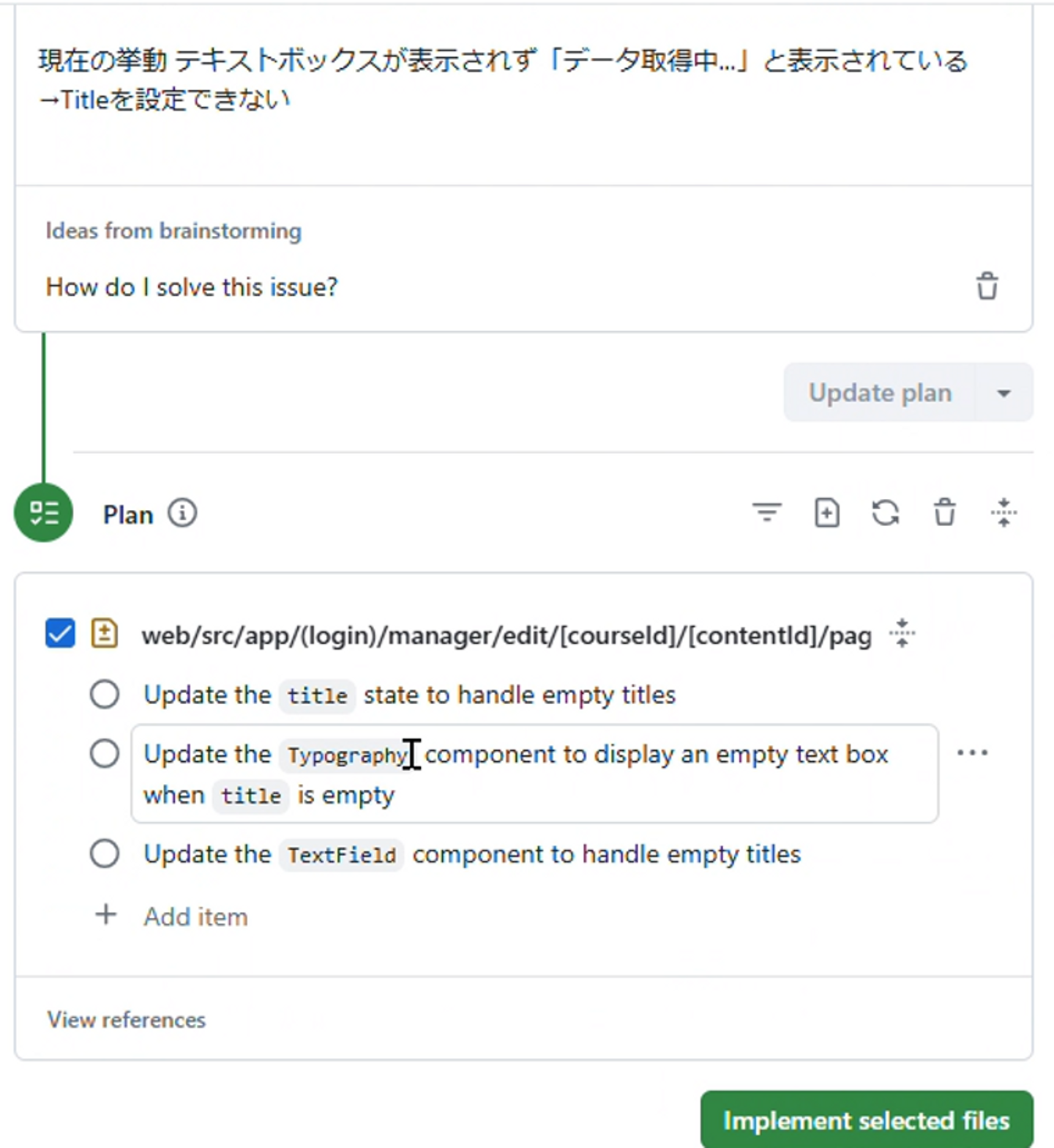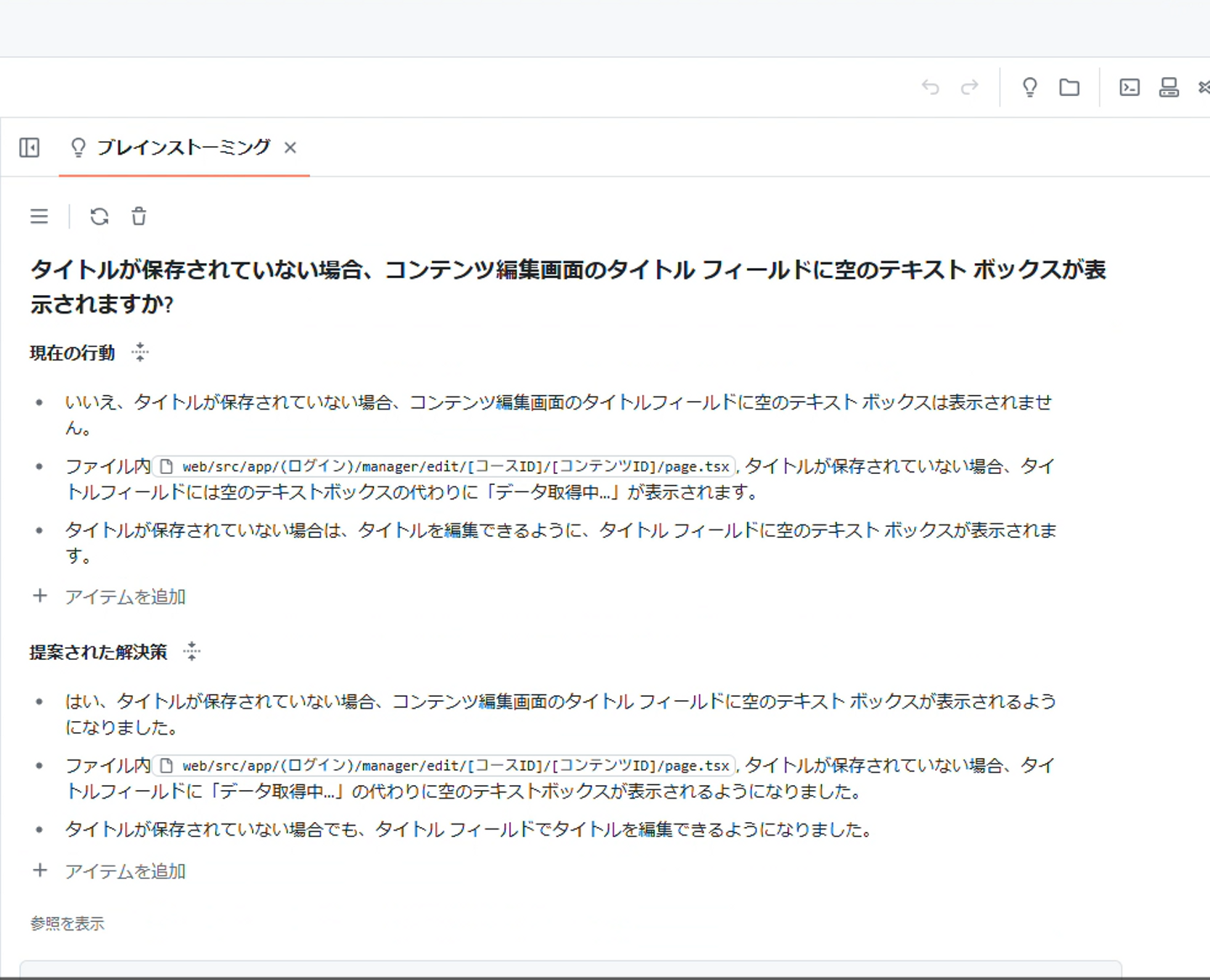 AIが現在の挙動と解決策を分析し、課題を整理してくれます。この段階で、自分でも訂正や追加が可能です。