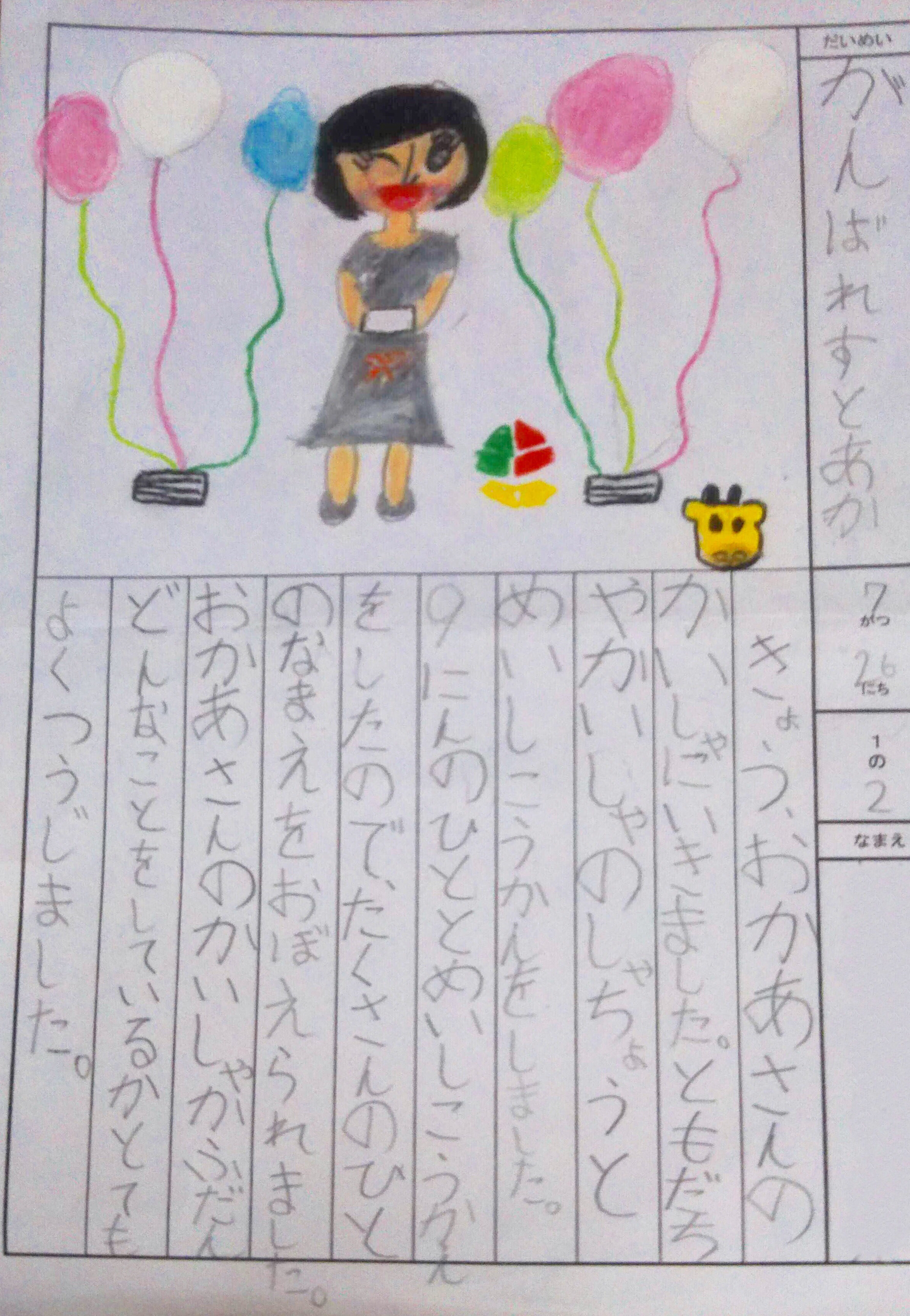 最後に、今回参加してくれたお子さまから嬉しいお便りをもらったのでご紹介します。ファミリーデーの日の夜、お家に帰ってさっそく絵日記を書いてくれたそうです。