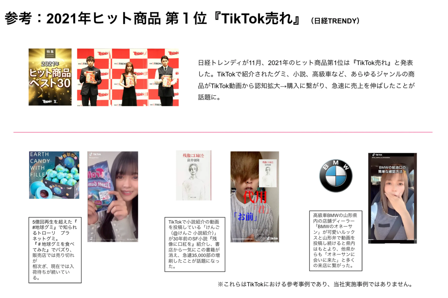 結果、TikTokは音楽、映画、ファッション、料理、エンタメなどありとあらゆるジャンルの中心となっています。TikTokをきっかけとして商品が売れていく「TikTok売れ」という言葉が流行したのも納得ですね!<