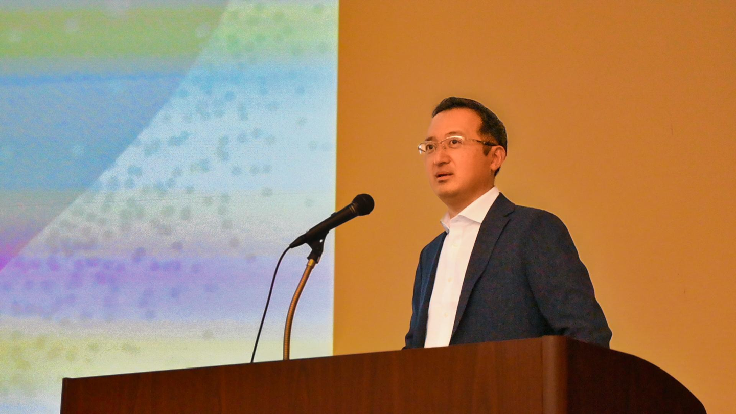 総会の全体司会を務める中途入社の営業Iさんから、弊社CHRO兼人事部長の今井さんへバトンタッチし入社式がスタート。