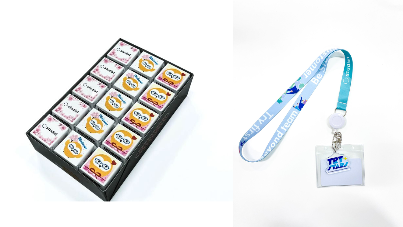 スタディストを選んでくれたメンバーに対して感謝の気持ちとスタディストの一員である証として、入社式では毎年スタディストのロゴが入ったタンブラー、ネックストラップとチロルチョコ一式をお送りしています。