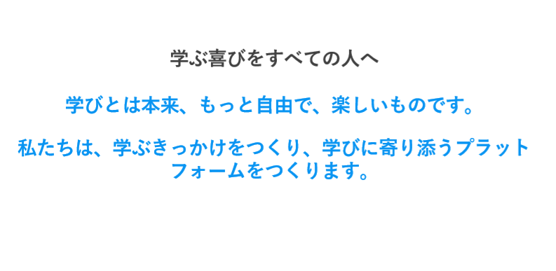 つまり、その人の目標や趣味趣向に関わらず、全ての人が学びと出会い楽しむことが出来るサービスを提供する会社だ、と考えました。