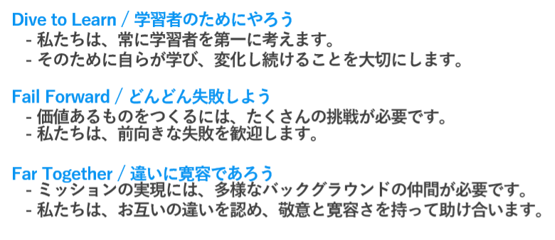 私たちが目指す「学ぶ喜びをすべての人へ」は、大きくそう簡単には実現できない目標です、だからこそバックボーンが違うメンバー同士寛容になり一緒に進んでいこうという思いです。