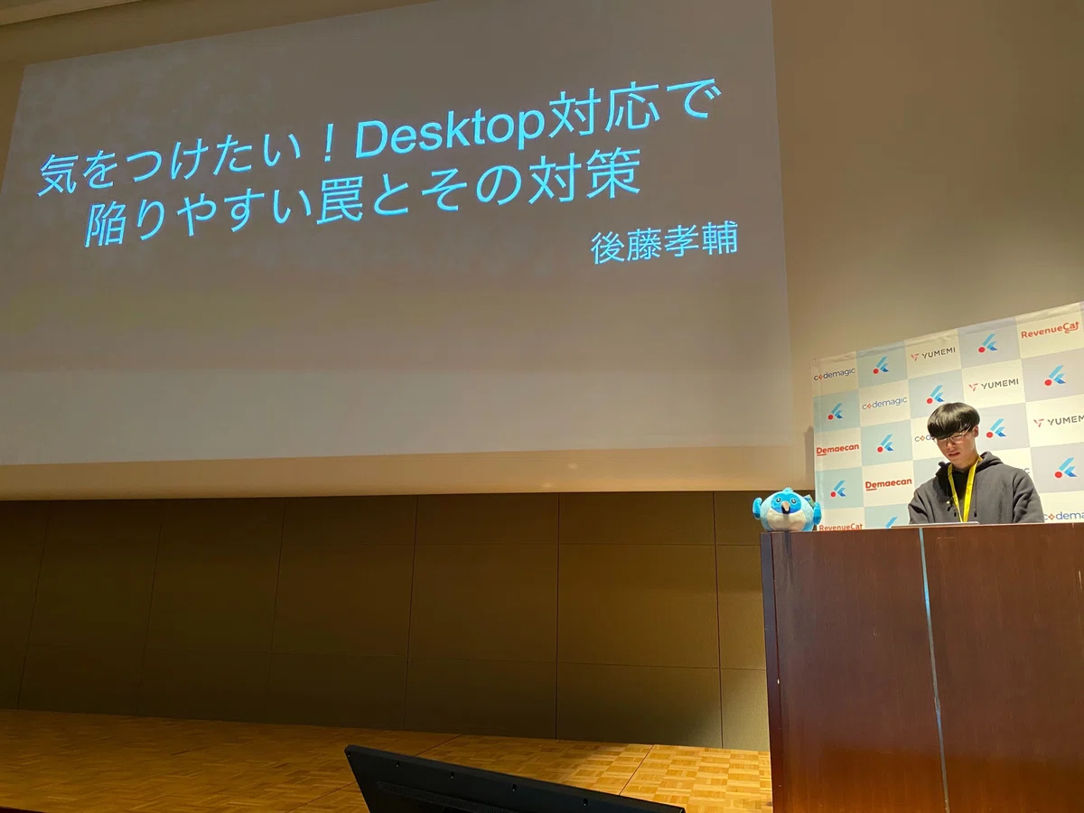 後藤:Flutterのモバイルアプリを、ウェブやデスクトップのプラットフォームで使えるように対応する際に気を付けたいポイントをテーマにお話しました。「Studyplus」のFlutterリプレイスはAndroidアプリを7割ほど進めた段階で、急きょWeb版を先にリリースすることになったんですが、その結果として色々な問題に直面したのでその辺りをシェアしました。