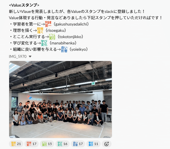 旧バリューより活用されている印象がありますし、同じタイミングで同僚に感謝の気持ちとともにピアボーナスを送ることができるUniposを導入したのですが、そこでもハッシュタグとして使われているのをよく目にします。今後も会社全体でどんどん活用できるようにしていきたいですね。