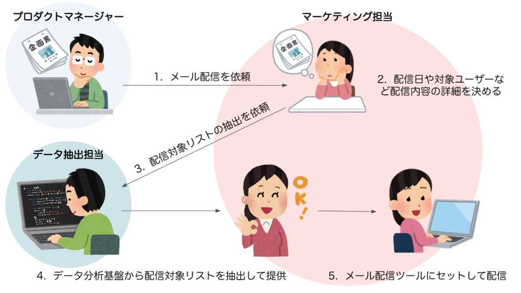 - マーケティンググループが、対象ユーザーリストと配信内容をメール配信ツールにセットして配信する