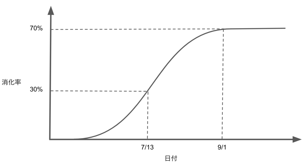 このため、グラフの最初の1ヶ月くらいは低い消化率で推移しています。