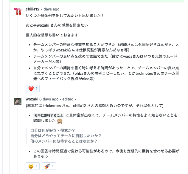 一度期待の差分が見えるとその後の活動に自然と反映されるかもしれませんし、またもしすり合わせの場が必要であればあらためてその場を設ければよいため、限られた時間をお互いの開示に使うのがわたしたちのチームにとっては効果的だと考えたからです。