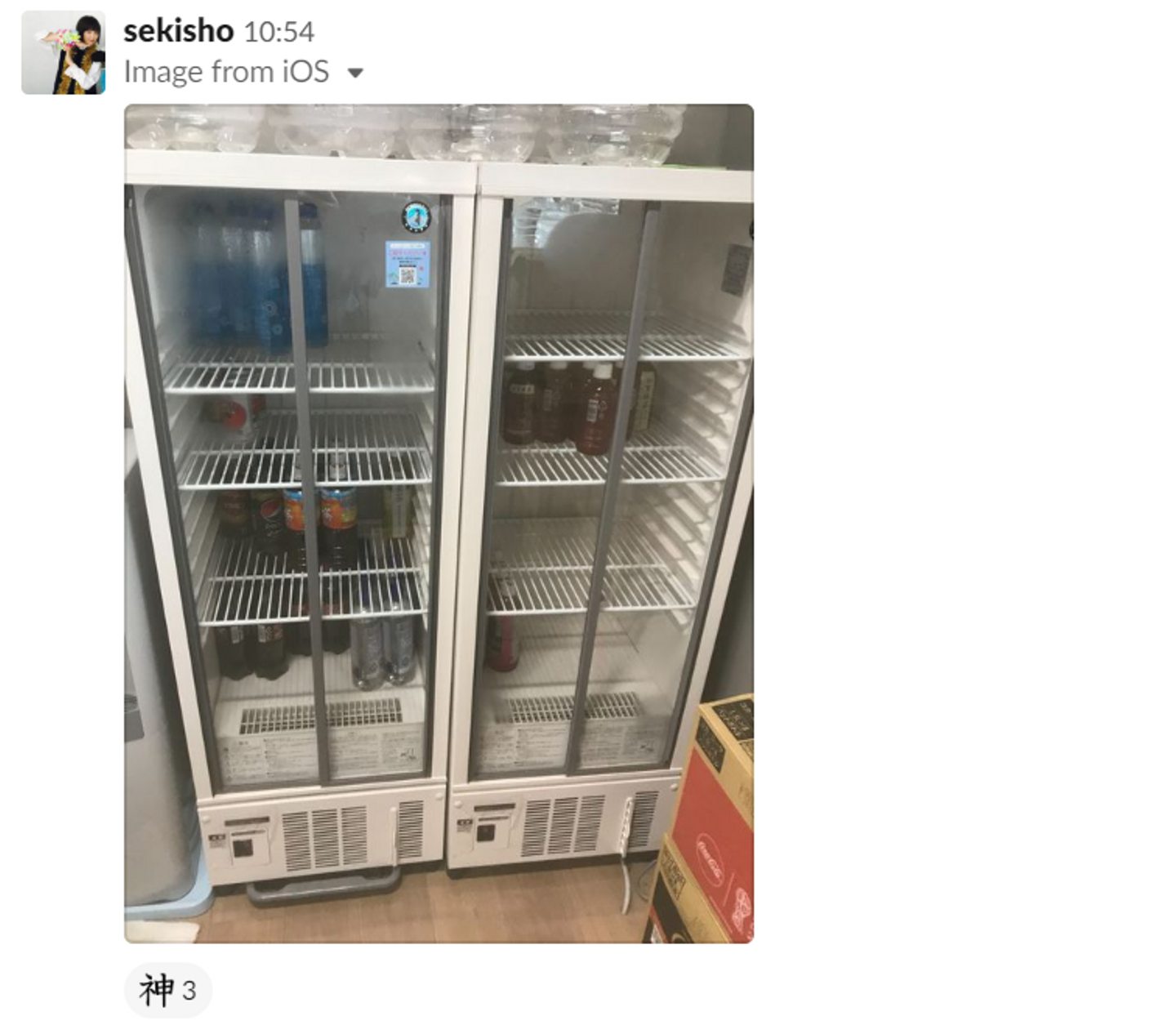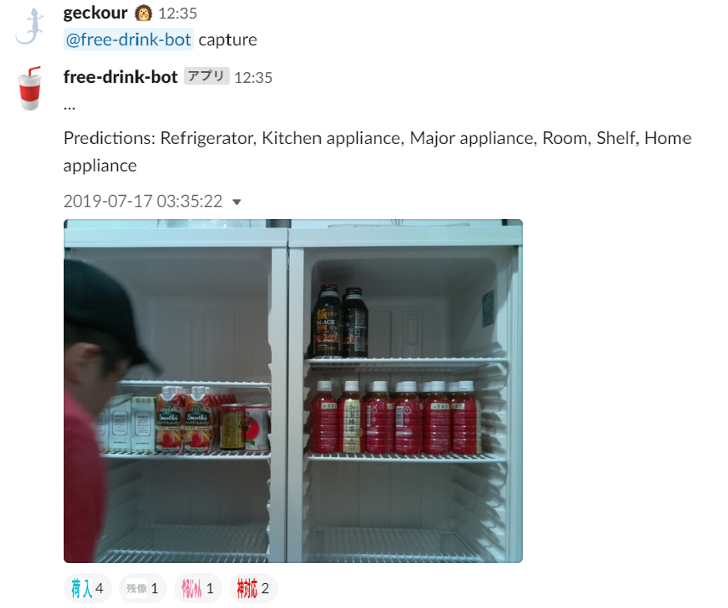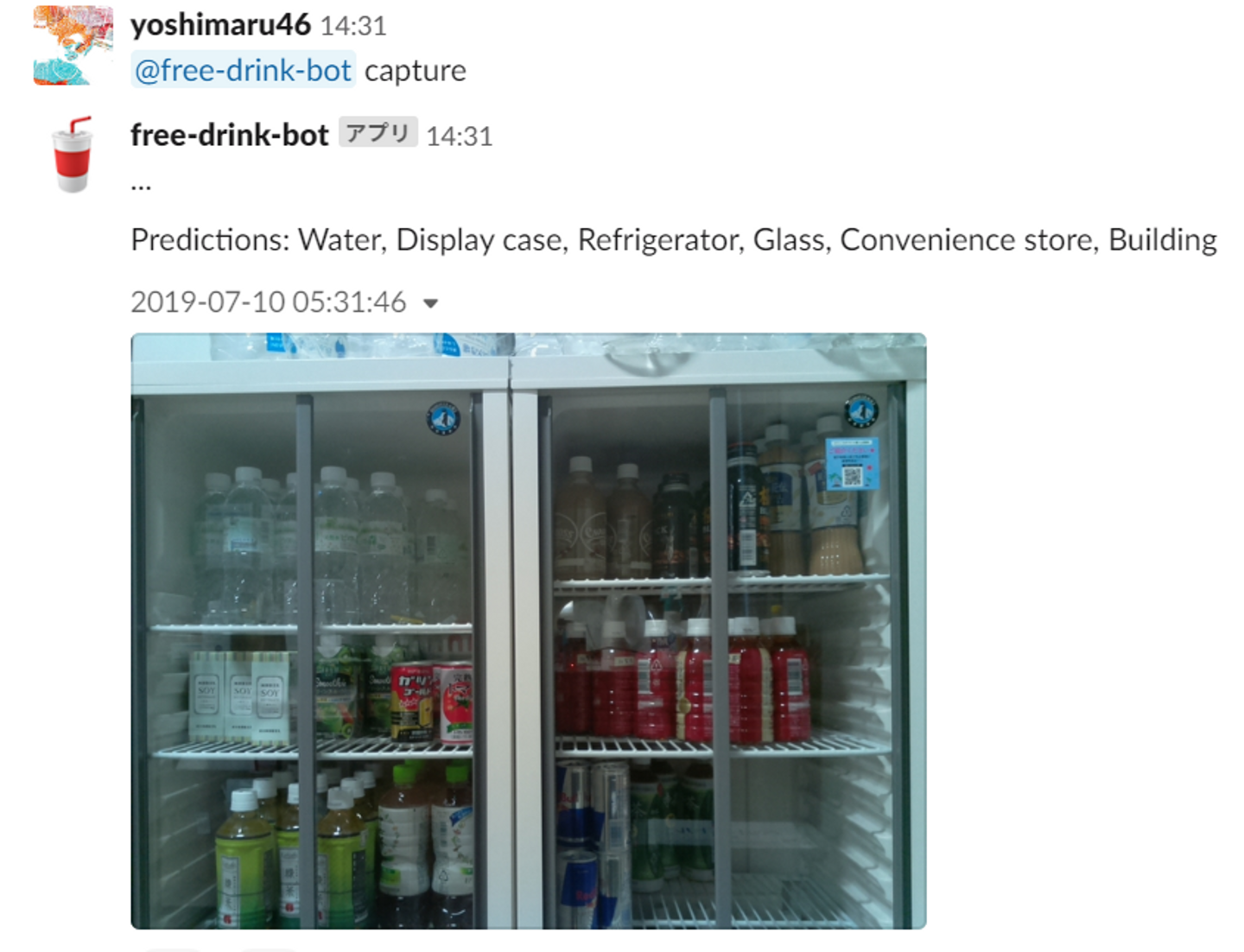 slackのチャネルでbotに呼びかけると、その瞬間の冷蔵庫の写真を撮り、チャネル内のメンバーに共有されます。