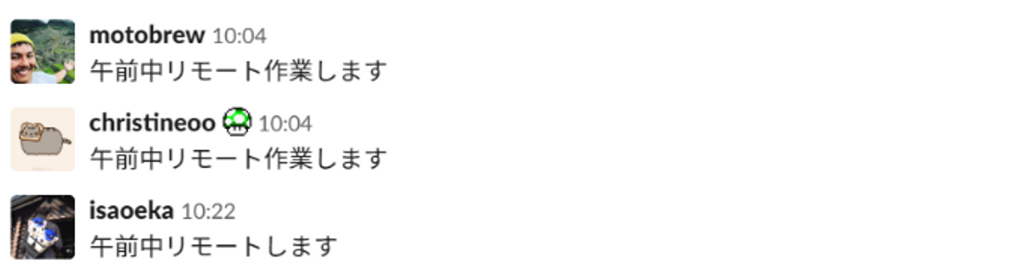 弊社では午前中はリモートワーク制度を利用して自宅で仕事をし、お昼に出社する社員が数多くいます。このように専用のslackチャンネルでチームのメンバーにその日のスケジュールをお知らせします。