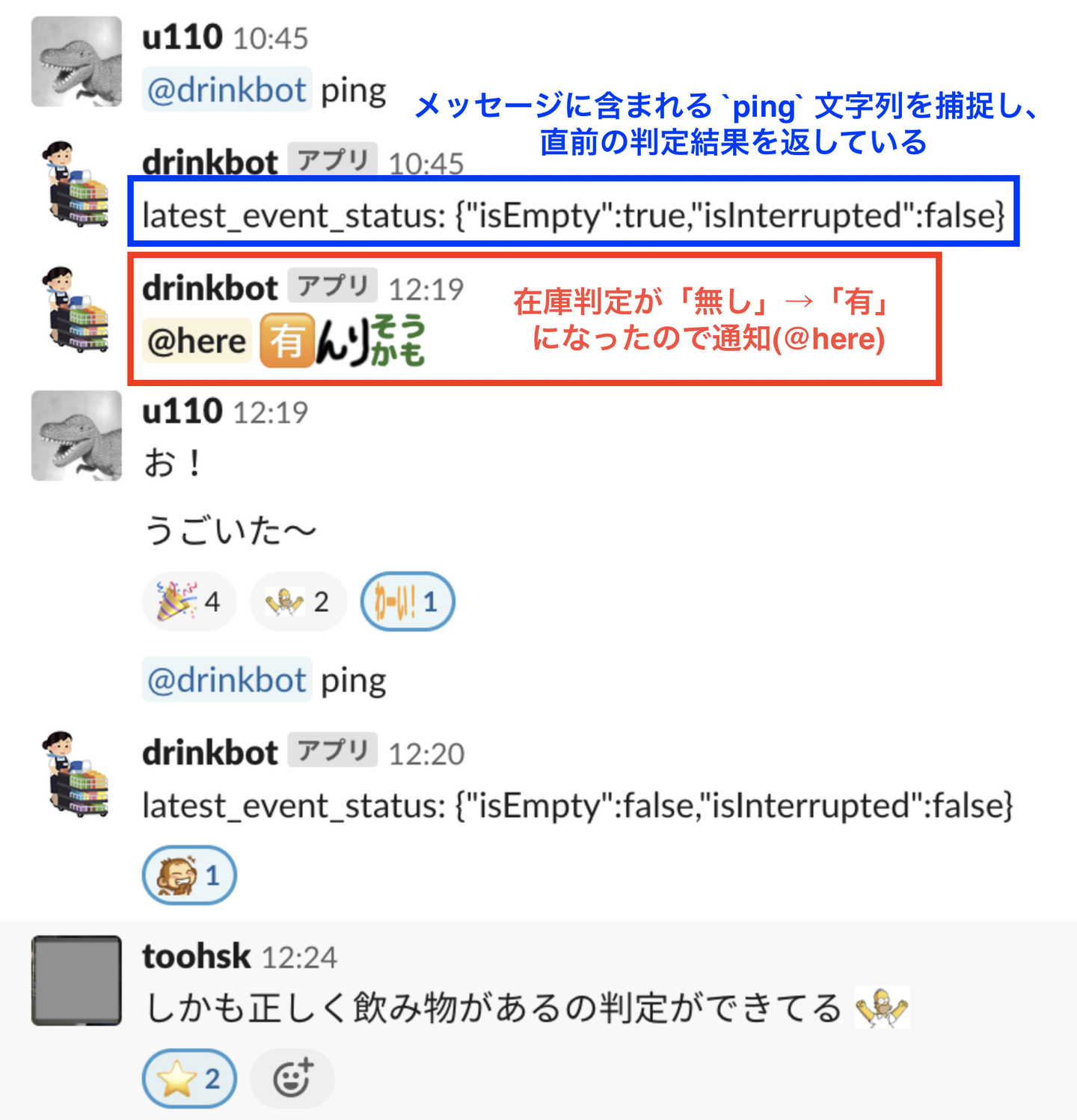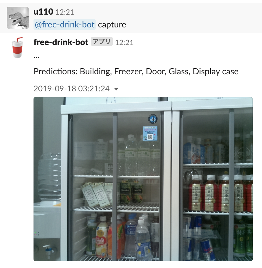 しかし、空っぽの写真だけが延々とチャンネルに流れていても意味がない (フリードリンクは大変人気で、入荷日以外は在庫が空状態で続くことも多いのです...)ので 在庫が空になり、その後飲み物が入荷したときだけ通知すればみんなが嬉しいのでは? と考えました。