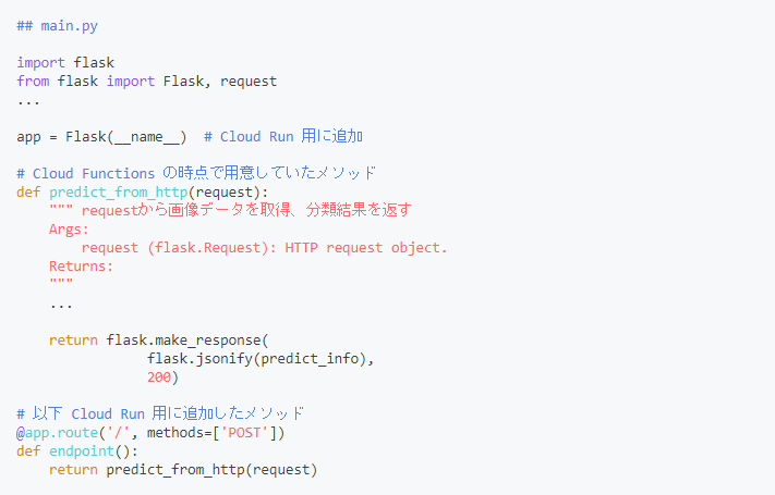 Cloud Runでは単一のアプリケーションとして動作するようにエンドポイントを追加する必要があります。 しかし、追加するコードはわずかでエンドポイントとなるメソッドを用意し、もともとCloud Functionsで使っていたメソッドを呼び出すだけでした(簡単!)