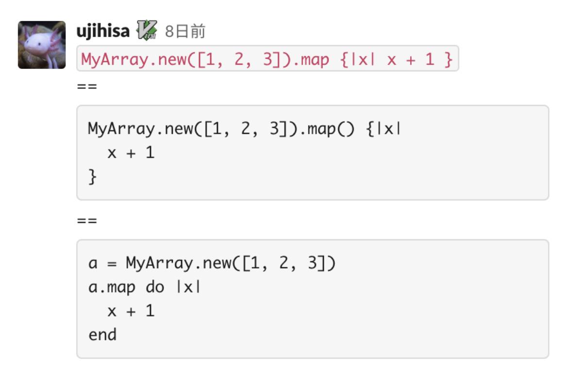 map は、MyArray.new([1,2,3]).map{|x| x + 1}