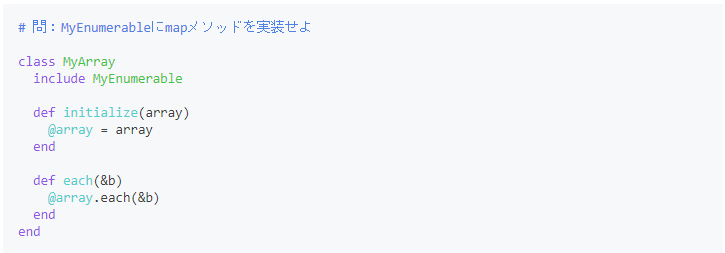 MyArray クラス(擬似 Array クラス)に each メソッドが実装してあります。その each を使って Array#map と同じ動きをする map メソッドを実装してみましょうという問題です。