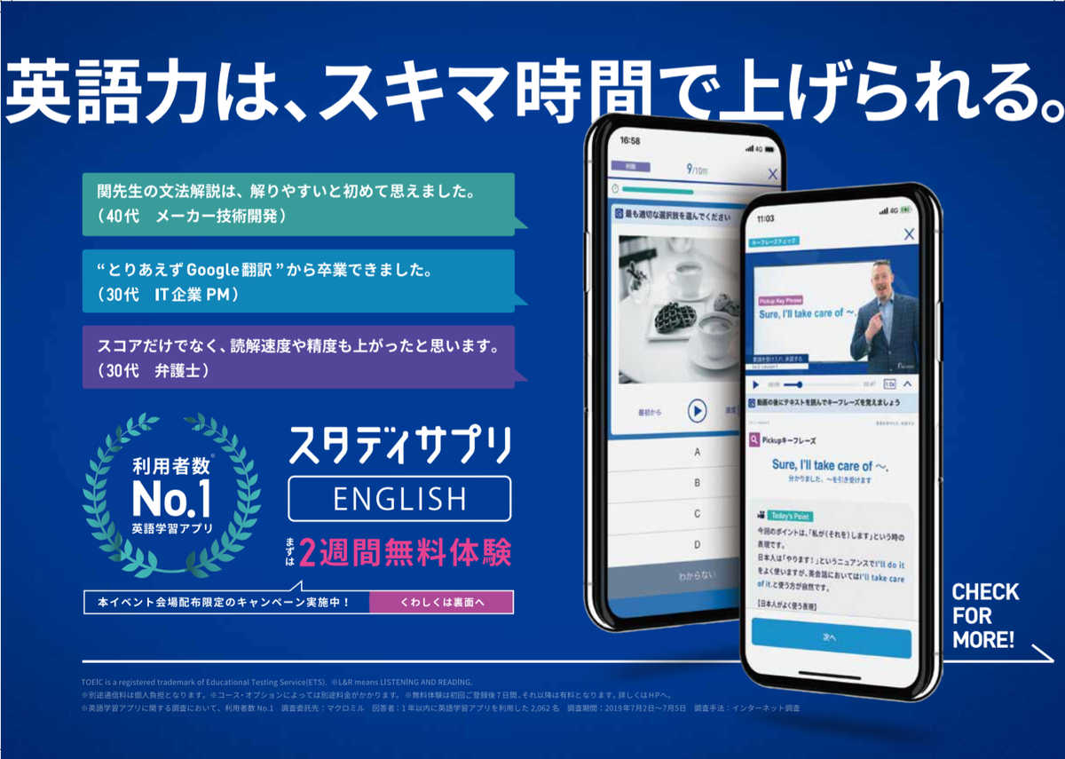VimConf 2019は国際カンファレンスであり、英語が主な言語なので英語の学習意欲を刺激することは間違いありません。 また、参加者のほとんどであるエンジニアにとって英語は必須スキルでもあります。 そのためのサービスを提供している会社としては絶好のプロモーションの機会だと考え、SlackでスタディサプリENGLISHのマーケティング担当の社員に依頼をしたところ、画像のようなチラシを用意していただけました。 2週間無料体験ができるプロモーションコードにVimの文字を入れていただけたのが個人的にも非常に嬉しいポイントでした。